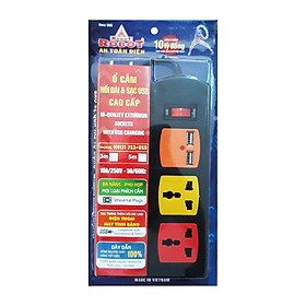 Ổ cắm điện đa năng 3 lỗ 2 chấu, 3 lỗ 3 chấu kèm 3 cổng sạc USB tiêu chuẩn, dây nối dài 1 38m #odien