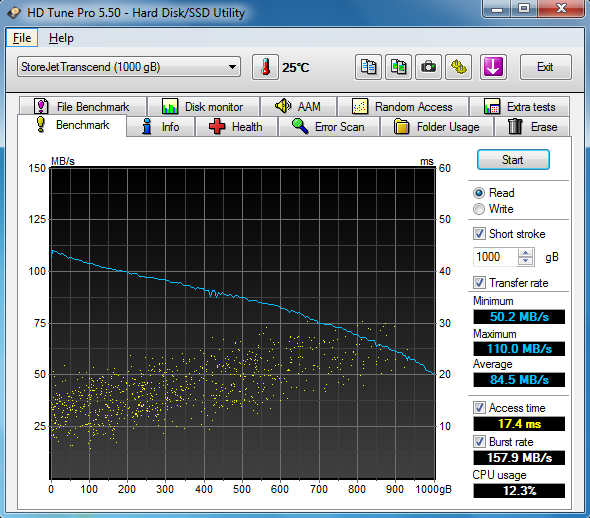 Khi kiểm tra tốc độ đọc của Trenscend Storejet M3 bằng phần mềm HD Tune Pro. Kết quả cho thấy Tốc độ đọc (Read) của M3 cao nhất là 110MB/s và thấp nhất là khoảng 50MB/s. Tốc độ này được duy trì khá ổn định.