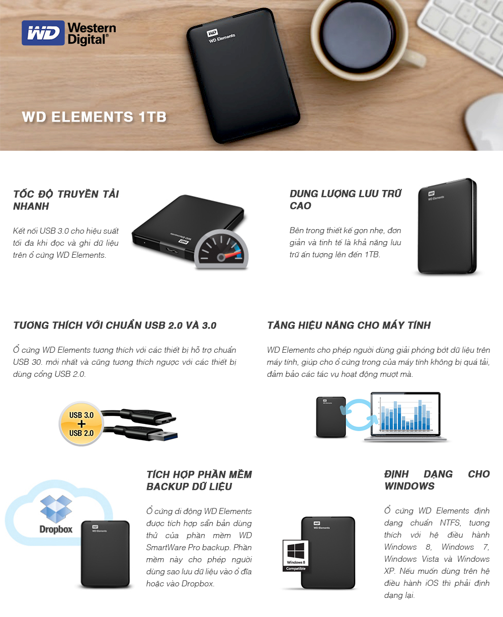 Đặc điểm của ổ cứng ngoài WD Elements dòng Desktop để bàn 3.5 inch USB 3.0 Độ tin cậy cao: Ổ cứng ngoài WD Elements dòng Desktop để bàn 3.5 inch được sản xuất với