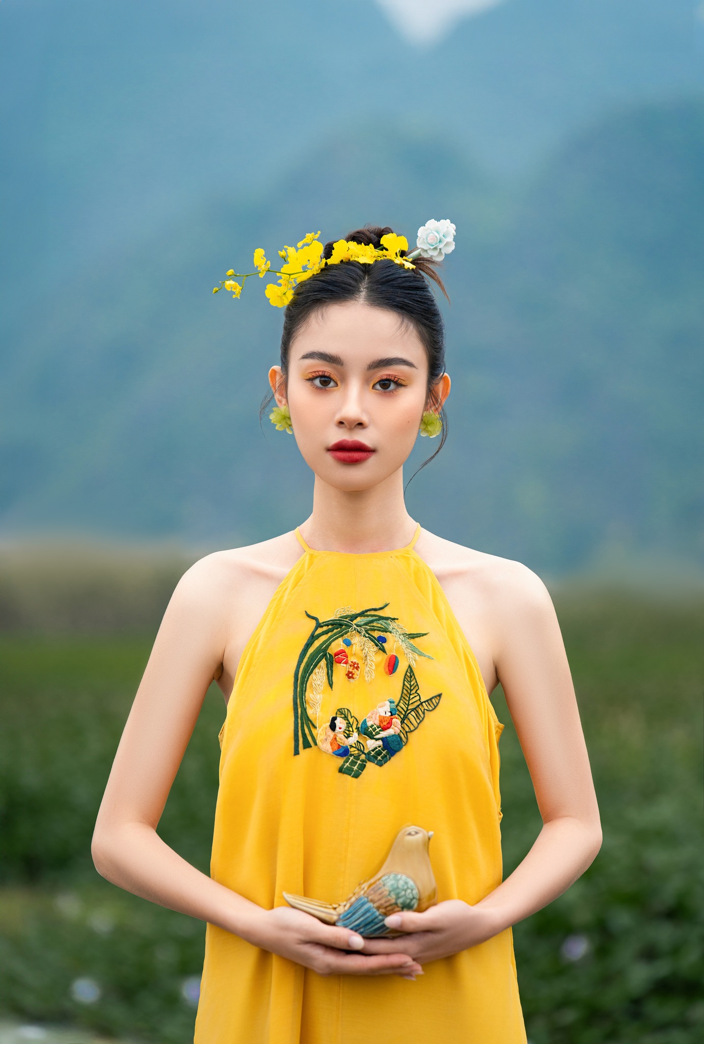 áo dài cách tân được may bằng chất liệu gấm thượng hạng, kết hoa tỉ mỉ, tay lỡ loe, quần xanh