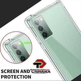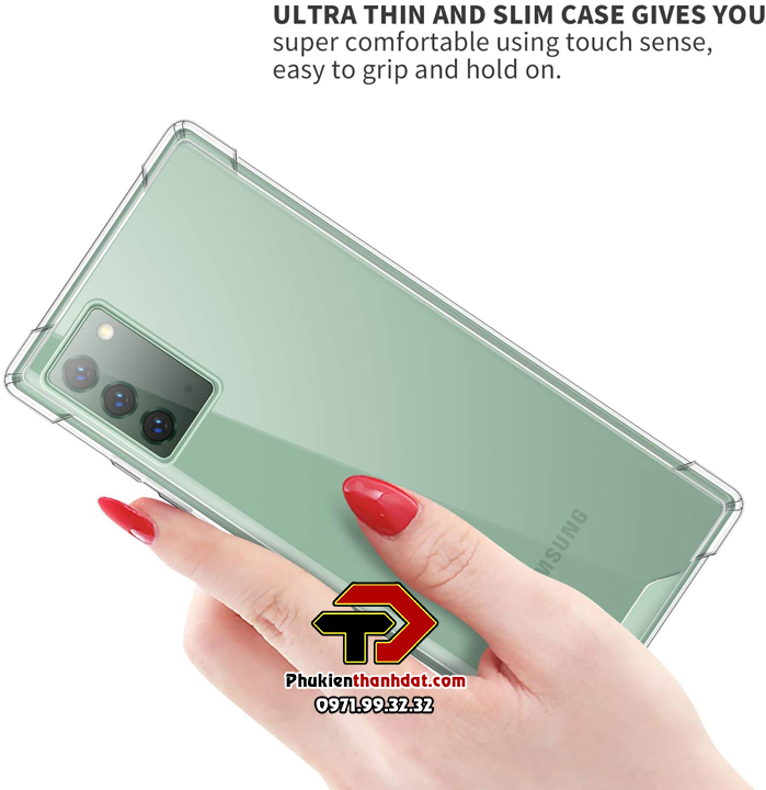 Ốp lưng dẻo trong chống sốcSamSung Galaxy Note 20 được làm từ chất liệu TPU dày 0.9 mm,mềm dẻo, trong suốt, có độ đàn hồi cao, có thể bóp lại, cuộn lại mà không biến dạng. Ốp lưng được thiết kế với 4 góc dày dặn hơn (hầu hết khi rơi máy các góc sẽ va chạm đầu tiến), kết hợp với phần khung viền từ nhựa dẻo TPU cao cấp khá dầy dặn (~1mm).Phần tiếp xúc với cạnh máy có làm thêm các đường gân không những giúp cho ốp cầm chắc tay hơn mà còn tăng khả năng đàn hồi, bảo vệ toàn bộ máy luôn an toàn trước mọi va chạm, mặt lưng còn 4 chấu nhỏ nhô cao để nâng phần lưng của máy lên khi để lên bàn hạn chế xước Camera sau của máy.Ốp lưng dẻo trong chống sốcSamSung Galaxy Note 20 các chi tiết được hoàn thiện rất đẹp, các vết cắt mịn, đều. Các phím bấm được làm nổi giúp thao tác dễ dàng.