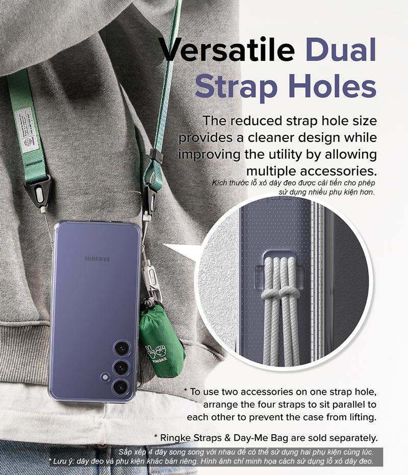 Kiểu dáng đẹp trong suốt dành riêng cho Samsung Galaxy S24 Ultra. Chống sốc tối đa, phân tán lực tác động tốt, đạt tiêu chuẩn chống sốc Quân đội Mỹ. Thiết kế cạnh gờ mặt lưng (vị trí camera) nhô cao 1.2mm và thiết kế cạnh viền màn hình nhô cao 1.5mm giúp chống trầy. Ốp được thiết kế 2 thành phần: mặt lưng nhựa cứng Polycarbonate và viền nhựa dẻo TPU giúp dễ dàng tháo lắp ốp Tương thích với sạc không dây wireless charging. Bạn có thể sạc mà không cần tháo rời ốp lưng. Nút bấm được bảo vệ và mang lại cảm giác bấm nhạy, các cổng kết nối thuận tiện. Kích thước lỗ xỏ dây đeo cải tiến cho phép treo (móc) được 2 phụ kiện cùng lúc. Lưu ý: dây đeo được bán riêng. Hình ảnh chỉ minh họa cách sử dụng sản phẩm. Tương thích với dán bảo vệ camera Ringke Lens Frame Glass, mua thêm dán camera để bảo vệ tối ưu cho thiết bị.