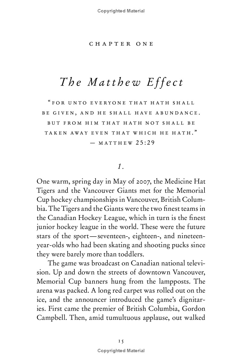 Why are people successful For centuries, humankind has grappled with this question. In this stunning new book, Gladwell takes us on an invigorating intellectual journey to show us what makes an overachiever. He reveals that we pay far too much attention to what successful people are like, and too little attention to where successful people are from: their culture, their family, and their generation. Gladwell examines how the careers of Bill Gates and the performance of world-class football players are alike; what top fighter pilots and The Beatles have in common; and why it is correct to say that the mathematician who solved Fermat's Theorem is not a genius