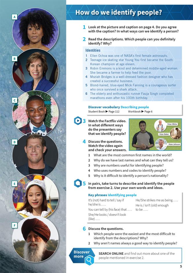 Each unit presents students with a unit question, and five lesson questions, encouraging students to examine the world more critically within an inquiry-based learning environment. The Student Book also includes Vocabulary and Grammar reference and practice, Project lessons, Literature lessons, and a Writing workshop.