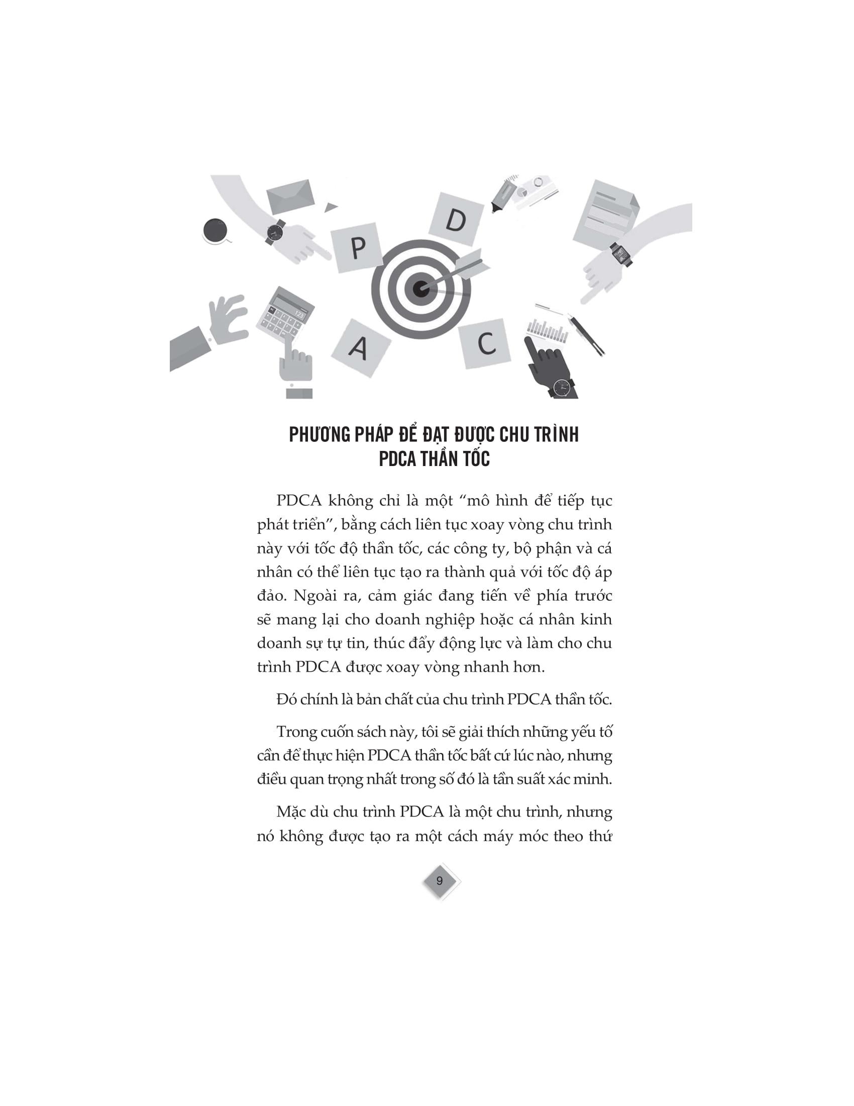 Chu trình PDCA bao gồm bốn bước PLAN (kế hoạch), DO (thực hiện), CHECK (tự đánh giá) và ADJUST (điều chỉnh), là một khuôn khổ cổ điển mà mọi doanh nhân đều biết, tuy nhiên, lại không nhiều người hiểu được hết để áp dụng trong doanh nghiệp của mình. Nhưng một khi nắm vững chu trình PDCA và thực hiện nó, bạn có thể đưa doanh nghiệp của mình phát triển với tốc độ chóng mặt; bạn sẽ không còn do dự hay lo lắng về những quyết định của mình; bạn sẽ luôn giữ được động lực để thực hiện mục tiêu đã đề ra ban đầu và doanh nghiệp hay thậm chí chính cuộc sống cá nhân của bạn sẽ đạt được kết quả tối ưu nhất.