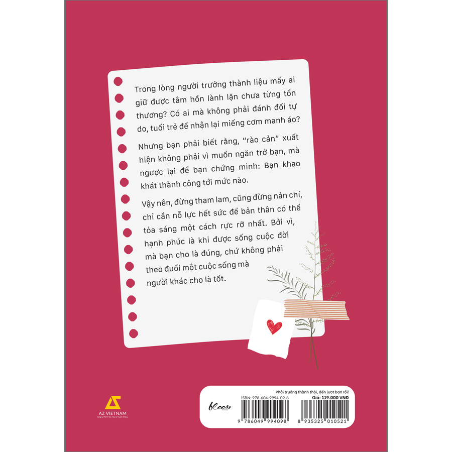 Hy vọng cuốn sách nhỏ này sẽ trở thành người đồng hành cùng bạn trong hành trình trưởng thành đầy rẫy những gian nan - nhưng cũng biết bao điều kỳ thú. Mỗi khi thấy nản chí hay mỏi mệt, hãy mở một trang sách bất kỳ, nhâm nhi từng dòng để cảm thấy trái tim của bạn được ôm ấp, vỗ về.