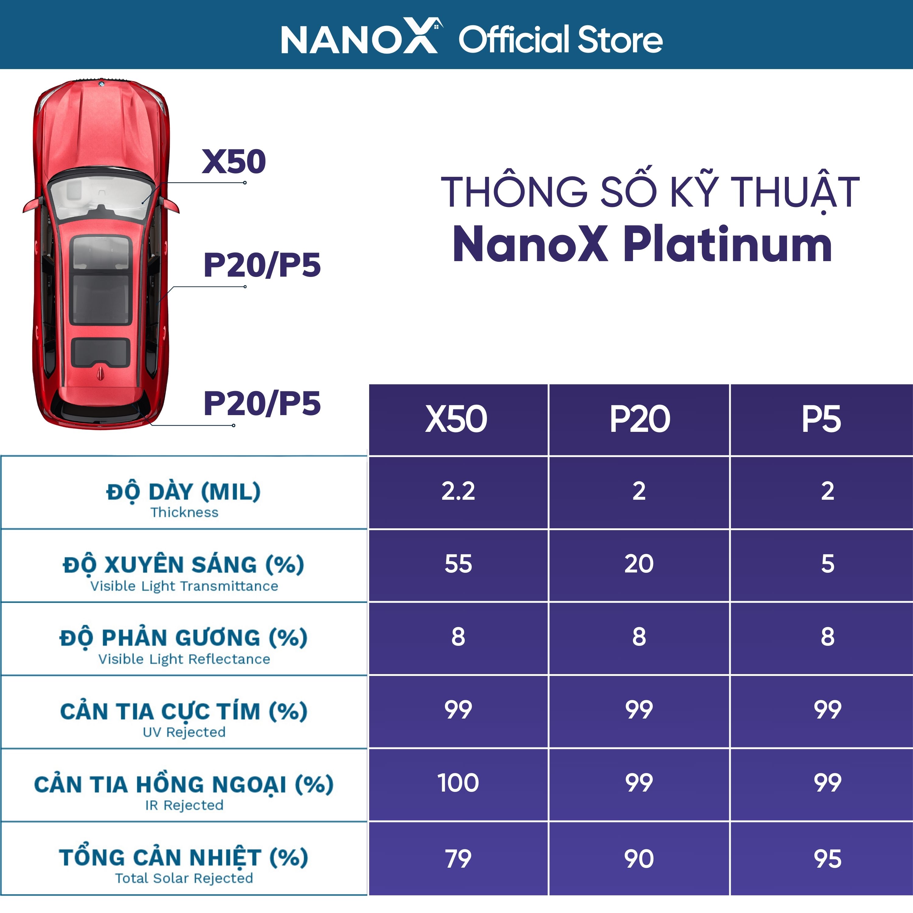 Mua tại TiktokNanoX là thương hiệu phim cách nhiệt ô tô và nhà kính tập trung Chống nóng chuyên sâu – Giải pháp UV – Bảo vệ sức khỏe. NanoX tự hào với các dòng phim cách nhiệt mạnh mẽ, ngăn chặn tuyệt đối những tia gây hại, mang đến không gian mát dịu, góp phần làm dồi dào hơn sức khoẻ thể chất lẫn tinh thần. Thông tin chung về Phim cách nhiệt ô tô Platinum 7 chỗ