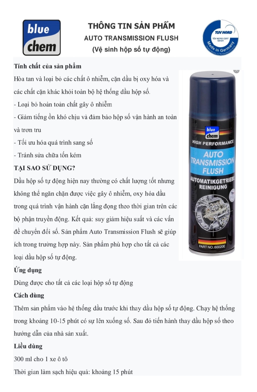 Phụ gia nhớt vệ sinh hộp số tự động cho xe ô tô Auto transmision Flush Bluechem 60020E được cấp chứng nhận TUV về an toàn và hiệu quả và Công nghệ duy nhất trên thế giới hiện nay kết hợp làm sạch và bảo vệ một cách toàn diện nhất.
