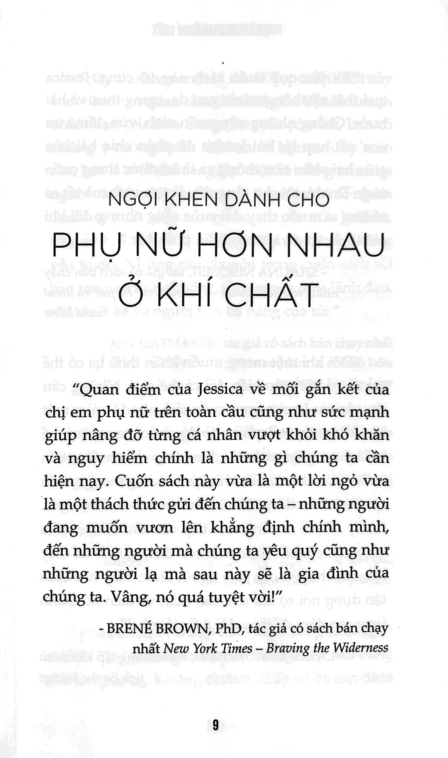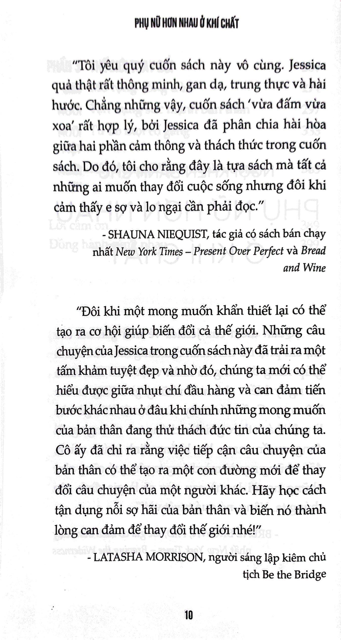 Mua tại Tiktok“Chúng ta có thể chọn cách tin tưởng giá trị của mình, bất kể tóc bạn dày hay mỏng, bất kể da bạn sáng hay tối màu, bất kể bạn thích trang điểm đậm hay theo đuổi vẻ tự nhiên. Chúng ta có giá trị bởi vì chúng ta đang tồn tại!” Với cuốn sách Phụ Nữ Hơn Nhau Ở Khí Chất, tác giả Jessica giúp người đọc thấu hiểu chính mình cũng như chỉ ra cách mà bạn có thể thực hiện ước mơ, dẫu đang e sợ đến nhường nào.