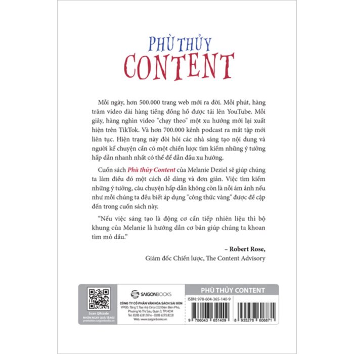 Phù Thủy Content Làm thế nào để ý tưởng luôn bất tận, độc đáo và chất lượng cao? Công thức vàng cho việc tìm kiếm ý tưởng Sáng tạo nội dung đòi hỏi bạn làm rất nhiều việc với sự nhất quán cao để có thể đạt được thành công. Lập kế hoạch thì quan trọng nhưng biết mình nên bắt đầu từ đâu mới là thách thức. Melanie Deziel đã giải quyết tất cả những điều đó cho bạn trong . Mỗi ngày, hơn 500.000 trang web mới ra đời. Mỗi phút, hàng trăm video dài hàng tiếng đồng hồ được tải lên YouTube. Mỗi giây, hàng nghìn video "chạy theo" một xu hướng mới lại xuất hiện trên TikTok. Và hơn 700.000 kênh podcast ra mắt mới liên tục. Hiện trạng này đòi hỏi các nhà sáng tạo nội dung và người kể chuyện cần có một chiến lược tìm kiếm những ý tưởng hấp dẫn nhanh nhất có thể để dẫn đầu xu hướng. Bộ khung tư duy nội dung của Melanie Deziel sẽ giúp chúng ta làm điều đó một cách dễ dàng và đơn giản. Bộ khung này sẽ làm bùng lên những ý tưởng mới để truyền tải thông điệp của bạn đến thế giới, giúp bạn trở nên nhiệt huyết trong việc sáng tạo nội dung theo những cách thậm chí bạn chưa từng nghĩ đến trước đây”. Việc tìm kiếm những ý tưởng, câu chuyện hấp dẫn không còn là nỗi ám ảnh nếu như mỗi chúng ta đều biết áp dụng "công thức vàng" được đề cập đến trong cuốn sách này.  - Cuốn sách dành cho những người sáng tạo nội dung Tác giả Melanie là người tiên phong trong lĩnh vực marketing nội dung và là một trong những bộ óc thông minh nhất trong ngành. Trong khi có rất nhiều bộ khung chiến lược nội dung rối rắm với 47 ô và các mũi tên chĩa vào nhau thì Phù thủy content lại rất đơn giản, dễ tiếp cận và sẽ giúp bạn sáng tạo các ý tưởng kể chuyện hay hơn. Cuốn sách The Content Fuel Framework gồm 10 chương với những câu chuyện và đặc biệt là bộ khung tư duy hiệu quả và cô đọng. Với những người đang làm việc với nội dung, chủ sở hữu doanh nghiệp nhỏ, chuyên gia nội dung và những người mới bắt đầu, Melanie Deziel cung cấp một bộ khung hữu ích và thiết thực. Bộ khung bao gồm những câu hỏi sâu sắc giúp sáng tạo ý tưởng và những cách thức khôn ngoan để lập kế hoạch xung quanh lịch biểu của bạn. Ghi lại quá trình hình thành ý tưởng giúp khán giả tiếp thu ý tưởng tốt hơn và giúp người sáng tạo đưa ra các cách mới để tiếp cận nhiều phân khúc khán giả, khiến họ trở nên hạnh phúc và hài lòng hơn. Cuối cùng, dù bạn chọn phương pháp tiếp cận nào thì cũng không thành vấn đề: bạn có thể thử một hoặc tất cả các phương pháp trong sách hoặc những phương pháp mà bạn biết, việc kết hợp một vài phương pháp hay tạo ra cách hoàn toàn mới để điều chỉnh bộ khung phù hợp với quy trình sáng tạo nội dung hiện có của bạn.