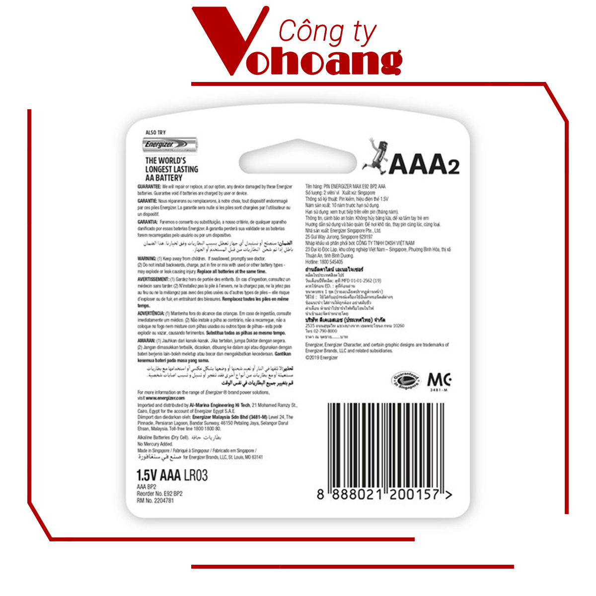 Pin AAA 1.5v Energizer E92-BP2 /LR03 Alkaline Power chính hãng , Xuất xứ Singapore /MẪU MỚI