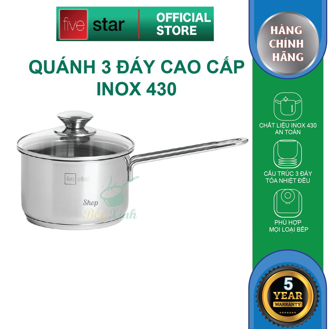 Quánh bột chống dính Inox 3 đáy Fivestar 12cm và 14cm dùng bếp từ chính hãng bảo hành 5 năm