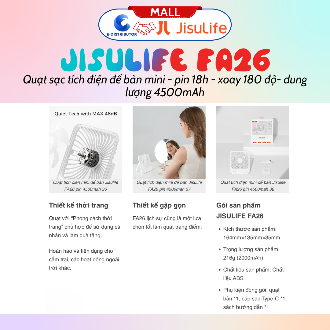 Mua tại TiktokQuạt tích điện mini để bàn Jisulife FA26 - pin 4500mah pin 18 giờ, xoay 180 độ - Hàng chính hãng
