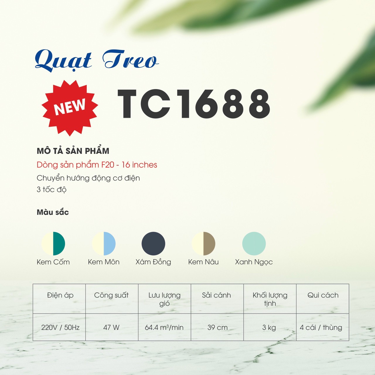 Sải cánh: 40cm Công suất: 55W Hệ số tiết kiệm năng lượng: 1,32 Điều chỉnh tốc độ: Điều Khiển Từ Xa Cầu chì chống cháy nổ: Có Lưu lượng gió: 77.7 m3/phút 3 Cánh quạt