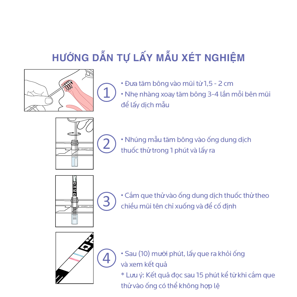 - Đây là sản phẩm tự xét nghiệm bằng cách sử dụng tăm bông lấy dịch mũi: Tự lấy mẫu đối với các cá nhân có độ tuổi từ 14 tuổi trở lên hoặc cần người lớn hỗ trợ đối với các cá nhân có độ tuổi từ 2 tuổi trở lên
