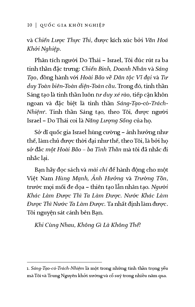 Là câu chuyện viết về sự phát triển thần kỳ của nền kinh tế Israel từ lúc lập quốc cho đến khi trở thành quốc gia có nền công nghệ hàng đầu thế giới. Quyển sách này có thể trả lời cho những thắc mắc làm thế nào một đất nước nhỏ bé lại có thể tồn tại giữa sự thù địch của các quốc gia lân cận, đối phó với những cuộc chiến giữ vững bờ cõi mà vẫn tạo ra sự sáng tạo vượt bậc trong các lĩnh vực công nghệ, quân sự và dân sự. Với ngòi bút sắc sảo, phong phú và tập trung những lời nhận xét thực tế từ những doanh nhân thành công hàng đầu, “Quốc gia khởi nghiệp” đã đem đến những cái nhìn mới mẻ về con người và đất nước Israel, làm sáng tỏ phần nào những thành công tưởng chừng như không tưởng của đất nước nhỏ bé này. Cá tính quyết liệt, dám thách thức và sáng tạo không ngừng của những con người Do Thái lưu vong, chạy trốn và sống sót sau những cuộc thảm sát trong Chiến tranh thế giới thứ II, không cam chịu cuộc sống nghèo khó, họ đã cùng với những người theo Chủ nghĩa Phục quốc Do Thái gây dựng và bảo vệ đất nước Israel bằng chính sức lực của mình và khiến cả thế giới phải kinh ngạc.Ngày nay, Israel là một trong những quốc gia có nền kinh tế phát triển nhất thế giới và có lĩnh vực công nghệ phát triển không hề thua kém Thung lũng Silicon của Hoa Kỳ. “Quốc gia khởi nghiệp” được xuất bản với hy vọng sẽ đem đến cho độc giả những bài học về khởi nghiệp của một quốc gia luôn có nền kinh tế phát triển sôi động, con người thì luôn hướng đến sự cách tân và hướng đến một tương lai tươi sáng hơn.