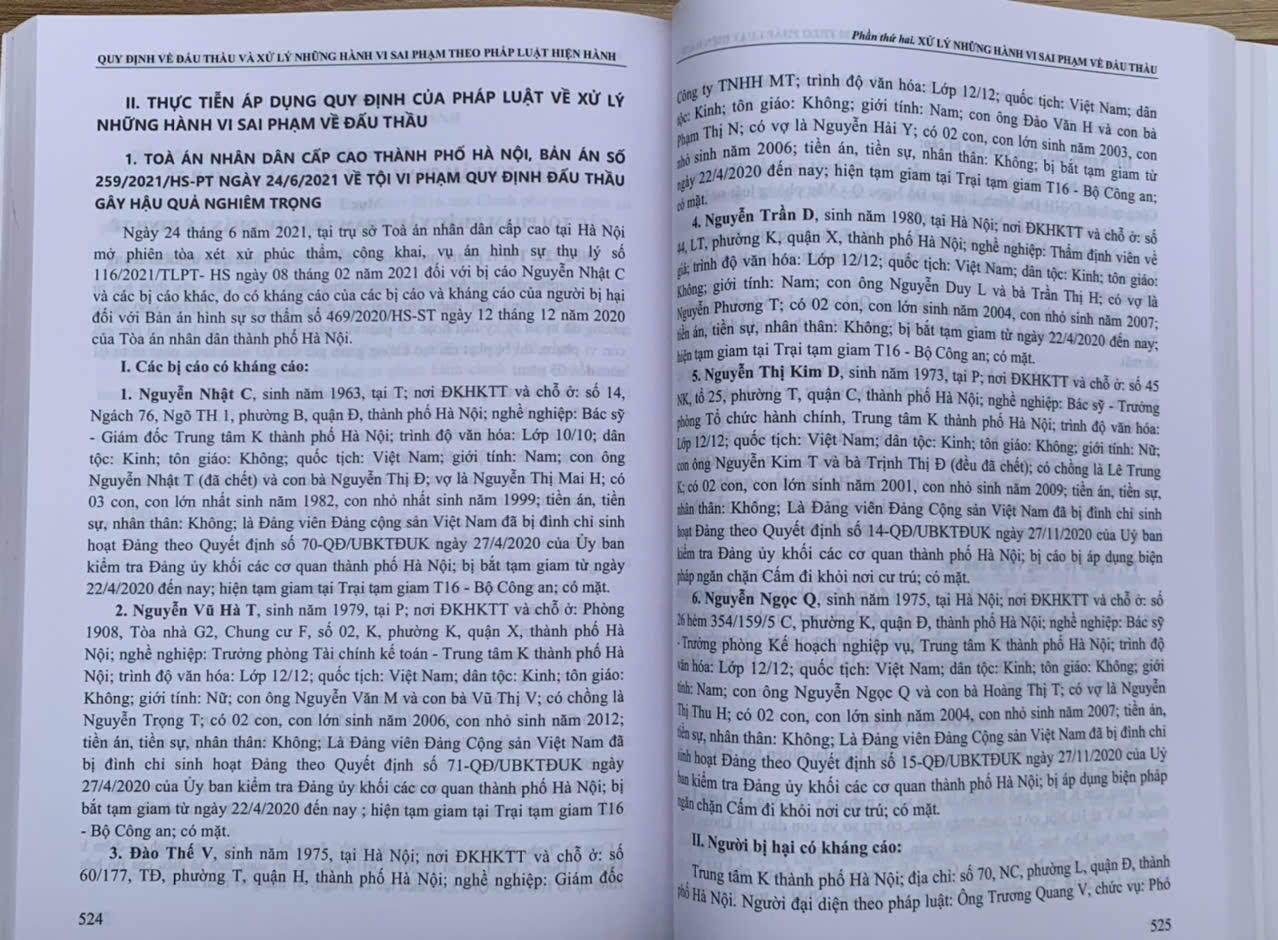 Quy định về đấu thầu và xử lý những hành vi sai phạm theo pháp luật hiện hành Tác giả: PGS.TS.GVCC Nguyễn Thị Ngọc Hoa Nhà xuất bản: Công an nhân dân Công ty phát hành: Dân Hiền Số trang: 648 Kích thước: 19 x 27 cm Năm xuất bản: Tháng 11 năm 2024 Giá bìa: 450.000 đ Nội dung nổi bật: Cuốn sách “Quy định về đấu thầu và xử lý những hành vi sai phạm theo pháp luật hiện hành” là một tài liệu chuyên sâu, cập nhật toàn diện các quy định pháp luật về đấu thầu và xử lý các hành vi sai phạm trong lĩnh vực này. Được viết bởi PGS.TS.GVCC Nguyễn Thị Ngọc Hoa, một chuyên gia uy tín trong lĩnh vực luật pháp, cuốn sách hướng đến việc hỗ trợ các nhà quản lý, chuyên gia pháp lý, và cá nhân làm việc trong các cơ quan công quyền hoặc tổ chức kinh tế nắm rõ các quy định hiện hành, đồng thời nâng cao hiệu quả áp dụng pháp luật vào thực tiễn. Cấu trúc cuốn sách: Phần I: Quy định về đấu thầu theo pháp luật hiện hành Phần này trình bày chi tiết các quy định pháp luật về đấu thầu, với nội dung chính bao gồm: Luật Đấu thầu 2023: Có hiệu lực từ ngày 1/1/2024, quy định các nguyên tắc, quy trình tổ chức và lựa chọn nhà thầu, cùng những cải cách quan trọng nhằm nâng cao tính minh bạch và hiệu quả của hoạt động đấu thầu. Hệ thống các nghị định, thông tư quan trọng: Nghị định số 23/2024/NĐ-CP và 24/2024/NĐ-CP: Hướng dẫn cụ thể các quy trình, điều kiện thực hiện đấu thầu. Thông tư số 02/2024/TT-BKHĐT và các thông tư liên quan: Quy định về đào tạo, cấp chứng chỉ và quản lý đấu thầu. Thông tư của Bộ Y tế (05/2024/TT-BYT): Danh mục thuốc, vật tư y tế được đấu thầu tập trung quốc gia, áp dụng hình thức đàm phán giá. Phần này tập trung vào việc cung cấp các quy định pháp lý chi tiết, cùng các mẫu biểu và công cụ hỗ trợ giúp việc thực thi trở nên dễ dàng và chính xác hơn.   Phần II: Xử lý những hành vi sai phạm về đấu thầu Phần này tập trung vào việc xử lý các vi phạm trong hoạt động đấu thầu, bao gồm: Quy định xử phạt hành chính: Dựa trên Nghị định số 122/2021/NĐ-CP và các văn bản liên quan, phần này trình bày các mức phạt và biện pháp khắc phục hậu quả đối với các hành vi vi phạm trong lĩnh vực đấu thầu. Áp dụng luật hình sự trong xử lý vi phạm đấu thầu: Các quy định từ Bộ luật Hình sự 2015 (sửa đổi, bổ sung 2017) về các tội danh liên quan đến đấu thầu, đặc biệt là những vi phạm gây hậu quả nghiêm trọng. Các vụ án tiêu biểu: Cung cấp 5 bản án từ các tòa án tại Hà Nội, Cao Bằng, Lạng Sơn với các bản án cụ thể từ năm 2021-2023. Mỗi vụ án được cung cấp chi tiết từ góc độ pháp lý, giúp người đọc hiểu rõ cách áp dụng quy định pháp luật trong thực tế.