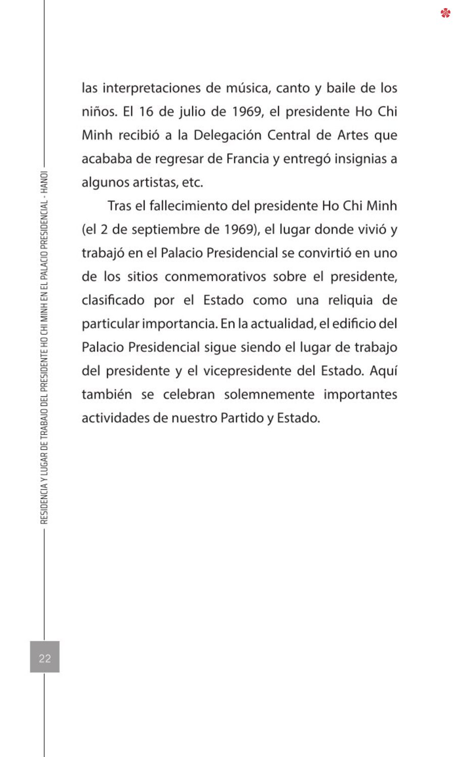 El libro Residencia y lugar de trabajo del presidente Ho Chi Minh en el Palacio Presidencial - Hanoi ofrece a los lectores un recurso valioso que nos ayuda a comprender mejor la vida del amado líder del de la nación vietnamita. El libro recrea de forma realista y lleva al lector a cada pequeño rincón, a cada recuerdo, a cada historia sencilla pero impregnada de significado histórico y humano sobre los lugares asociados al presidente Ho Chi Minh en el Palacio Presidencial como: la Casa 54, la Casa sobre pilotes, la Casa 67, el estanque de peces, el camino de mangos, lentre otros.