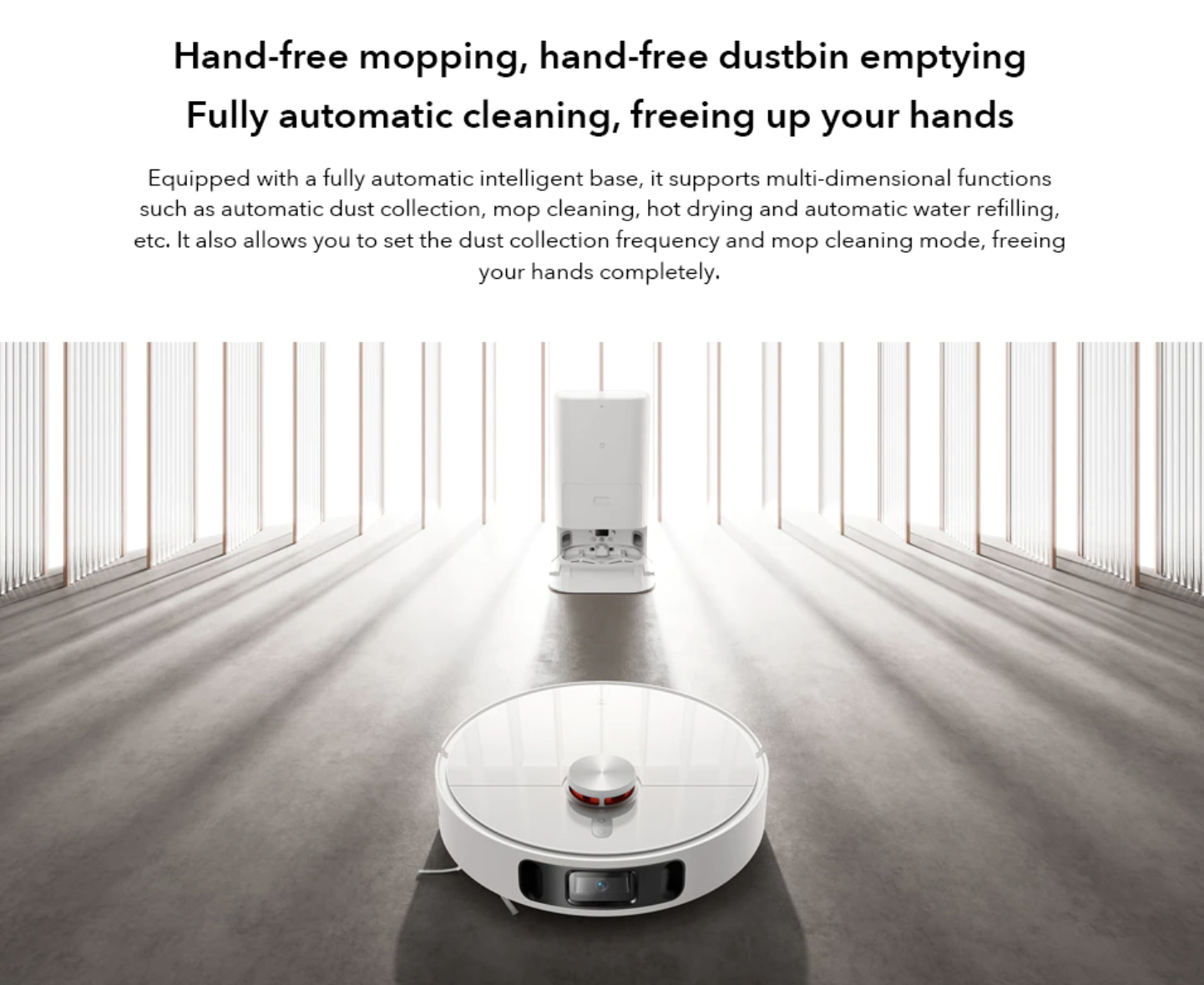 Bên cạnh chức năng hoạt động như một trạm sạc cho robot, thì phần dock đi kèm với robot còn hỗ trợ chức ănng tự động dọn dẹp bụi, giặt, sấy nóng và khử trùng khăn lau cho máy hút bụi. Người dùng cũng không cần phải thực hiện thủ công các thao tác thay nước hay đổ nước. Sau khi hoàn thành thao tác giặt sấy khăn lau, máy sẽ tự động đổ đầy nước vào thùng chứa nước thải. Ngoài ra máy cũng được thiết kế chống tắc nghẽn hiệu quả tránh việc hút bụi sẽ làm tắc nghẽn đường ống thải gây ảnh hưởng đến quá trình vận hành máy.