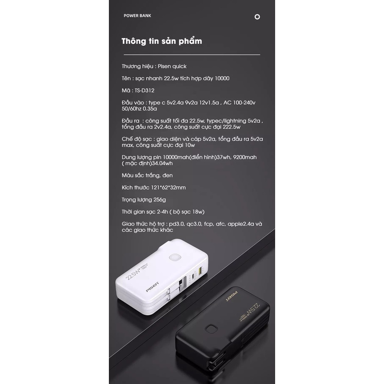 Sạc dự phòng dung lượng lớn 10000mAh, hỗ trợ đa giao thức sạc nhanh, phù hợp với 99% các thiết bị thông minh trên thị trường với công suất sạc ra tối đa 22.5W. Sạc được trang bị IC thông minh, tự điều chỉnh dòng điện, sạc nhanh an toàn, không hại pin, bảo vệ thiết bị hiệu quả.