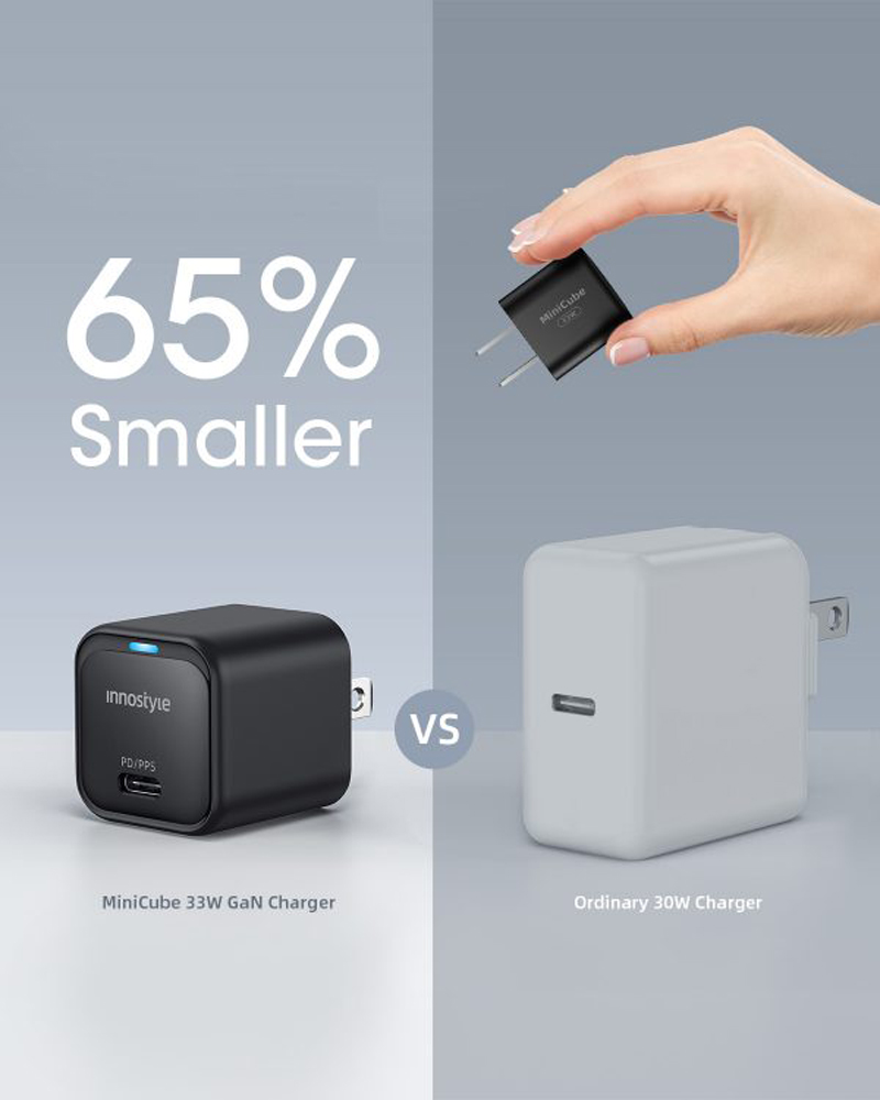 Sạc nhanh Innostyle MiniCube GAN II được thiết kế theo phong cách đơn giản, có kích thước vô cùng nhỏ nhắn, mỏng nhẹ mang đến cảm giác nhẹ nhàng, thanh lịch phù hợp sử dụng trong văn phòng, nhà ở. Ngoài ra, IC33PD còn có tốc độ sạc độ sạc nhanh hơn so với bộ sạc thông thường với công suất đầu ra lên 33W.