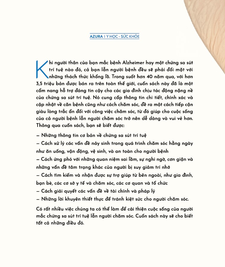 Khi người thân của bạn mắc bệnh Alzheimer hay một chứng sa sút trí tuệ nào đó, cả bạn lẫn người bệnh đều sẽ phải đối mặt với những thách thức khổng lồ. Trong suốt hơn 40 năm qua, với hơn 3,5 triệu bản được bán ra trên toàn thế giới, cuốn sách này đã là một cẩm nang hỗ trợ đáng tin cậy cho các gia đình chịu tác động nặng nề của chứng sa sút trí tuệ. Nó cung cấp thông tin chi tiết, chính xác và cập nhật về căn bệnh cũng như cách chăm sóc, đề ra một cách tiếp cận giàu lòng trắc ẩn đối với công việc chăm sóc, từ đó giúp cho cuộc sống của cả người bệnh lẫn người chăm sóc trở nên dễ dàng và vui vẻ hơn.