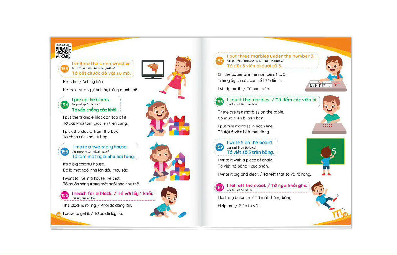 Mua tại TiktokSách 900 Câu Tiếng Anh Giao Tiếp Thường Dùng Hàng Ngày - Cẩm Nang Cho Mẹ Cùng Con Học Tiếng Anh Mỗi Ngày (Kèm File Nghe - Quét QR) GIỚI THIỆU SẢN PHẨM: Cuốn sách gồm 900 câu đàm thoại tiếng Anh để cha mẹ cùng con có thể giao tiếp về các chủ đề xung quanh cuộc sống hằng ngày, từ lúc thức dậy vào buổi sáng, đi học, đi chơi, đi siêu thị … cho đến lúc đi ngủ. Có cuốn sách này thì cha mẹ không lo bí từ, không biết nói tiếng Anh như thế nào cùng con. Đây là cuốn cẩm nang giúp cho cha mẹ có cơ hội học tập và giao tiếp tiếng Anh cùng con, để cả hai cùng tiến bộ mỗi ngày. Sách có kèm file nghe quét mã QR với giọng đọc tiếng Anh chuẩn để cha mẹ và con cùng nghe và tắm ngôn ngữ mỗi ngày. HƯỚNG DẪN BẢO QUẢN SÁCH THIẾU NHI: