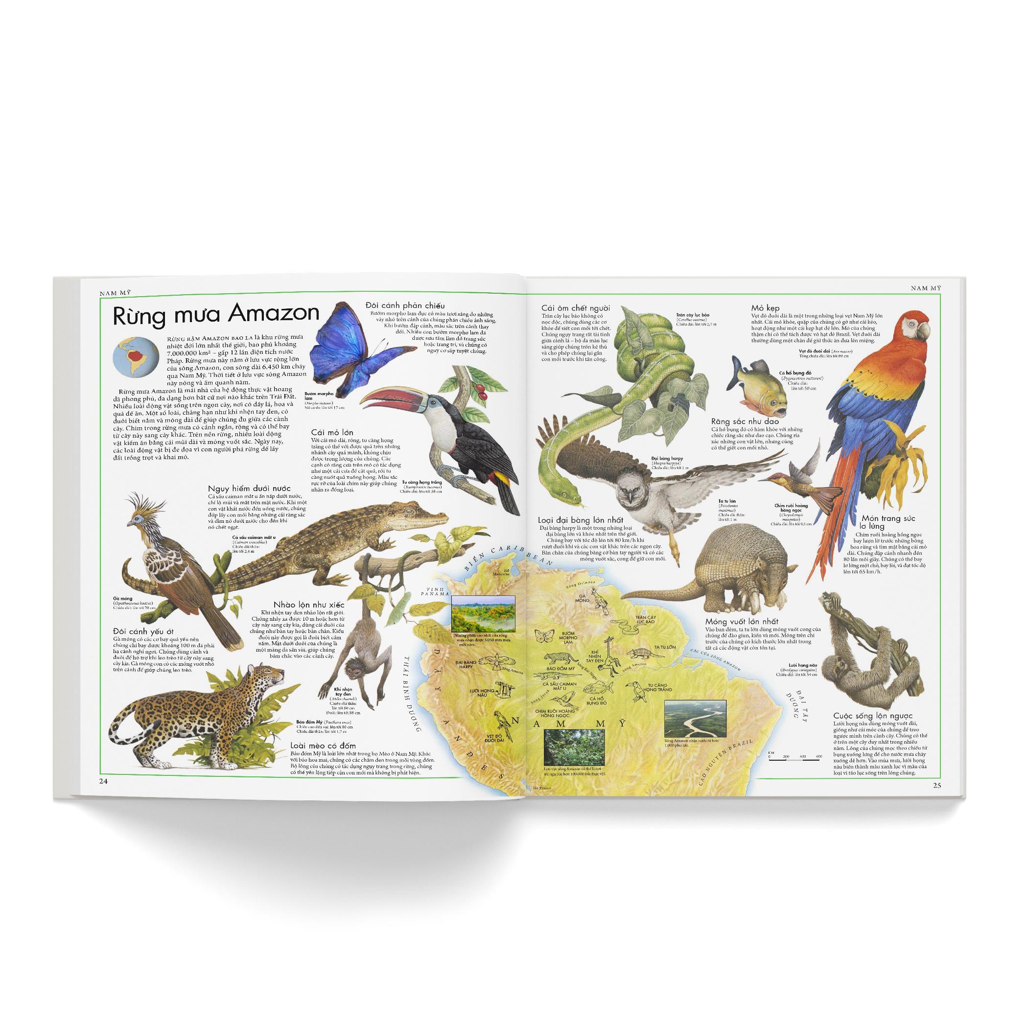 - Phát hành: /2023 NỘI DUNG SÁCH: Atlas động vật - Bách khoa bằng hình về các loài động vật hoang dã trên thế giới mang đến một góc nhìn đẹp đẽ và đắm say về thế giới tự nhiên, đầy ắp các hình ảnh minh họa xuất sắc, những bản đồ chi tiết và nguồn thông tin dồi dào lôi cuốn. Với cuốn sách này, các bạn đọc nhỏ được thỏa sức khám phá các châu lục và quốc gia trên thế giới, từ vùng Bắc Cực lạnh giá đến các hoang mạc phía tây, sang dãy Andes, rừng mưa hay vùng Siberia… Mỗi vùng đất lại có điều kiện địa lý, khí hậu khác nhau; cùng với đó là các loài thú, chim, bò sát, cá và côn trùng đặc trưng ở từng khu vực… Các em hãy cùng tìm hiểu các loài sinh vật khác nhau trên thế giới sống ở đâu, môi trường sống của các loài này như thế nào, chúng tồn tại trong khí hậu rất nóng hay rất lạnh ra sao… Rất nhiều điều thú vị đang chờ em khám phá trong cuốn sách này nhé!