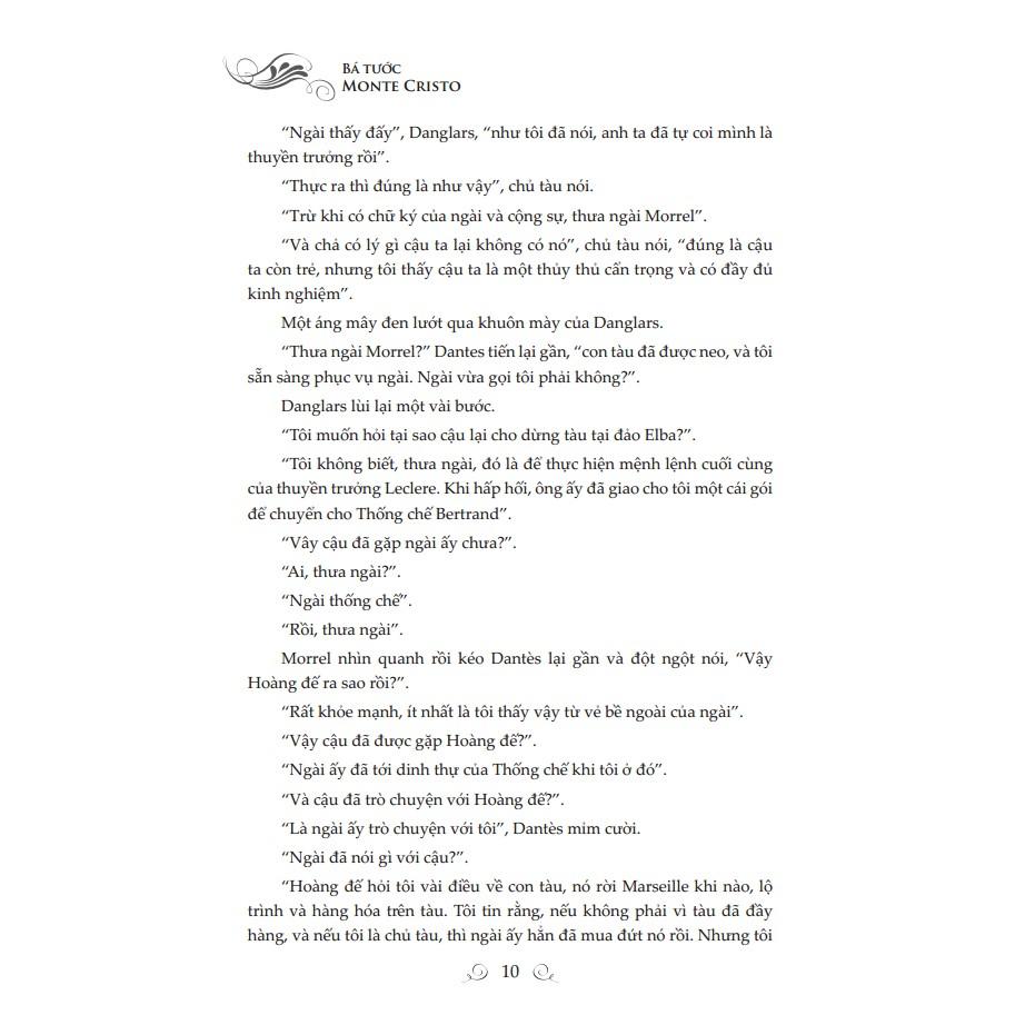 Tác giả: Alexandre Dumas Dịch giả: Thảo Linh – T Hoàng Quỳnh Hoa (hiệu đính) NXB: Văn Học Giá: 220.000 VNĐ số trang: 1112 trang khổ: 16x24cm bìa: Cứng năm xuất bản 2022 -------------Giới thiệu sách---------------- Bá tước Monte Cristo (bìa cứng) Bá tước Monte Cristo là cuốn tiểu thuyết kinh điển nổi tiếng nhất của nhà văn người Pháp - Alexandre Dumas, viết về tình yêu và hận thù tuy là hai thái cực tưởng như trái ngược nhưng lại liên tục giao nhau tạo nên dấu ấn đặc biệt trong đời sống xã hội Pháp thế kỷ XIX. Lấy bối cảnh nước Pháp thời Napoleon, tác phẩm là câu chuyện kể về nỗi oan ức của chàng Dantes khi bị những kẻ ganh ghét, đố kỵ hãm hại, về tình yêu của chàng với Mercedes và cuộc hành trình trở về đầy hận thù, căm ghét nhưng nở rộ sự yêu thương và lòng bao dung. thích trong suốt hai thế kỷ qua.