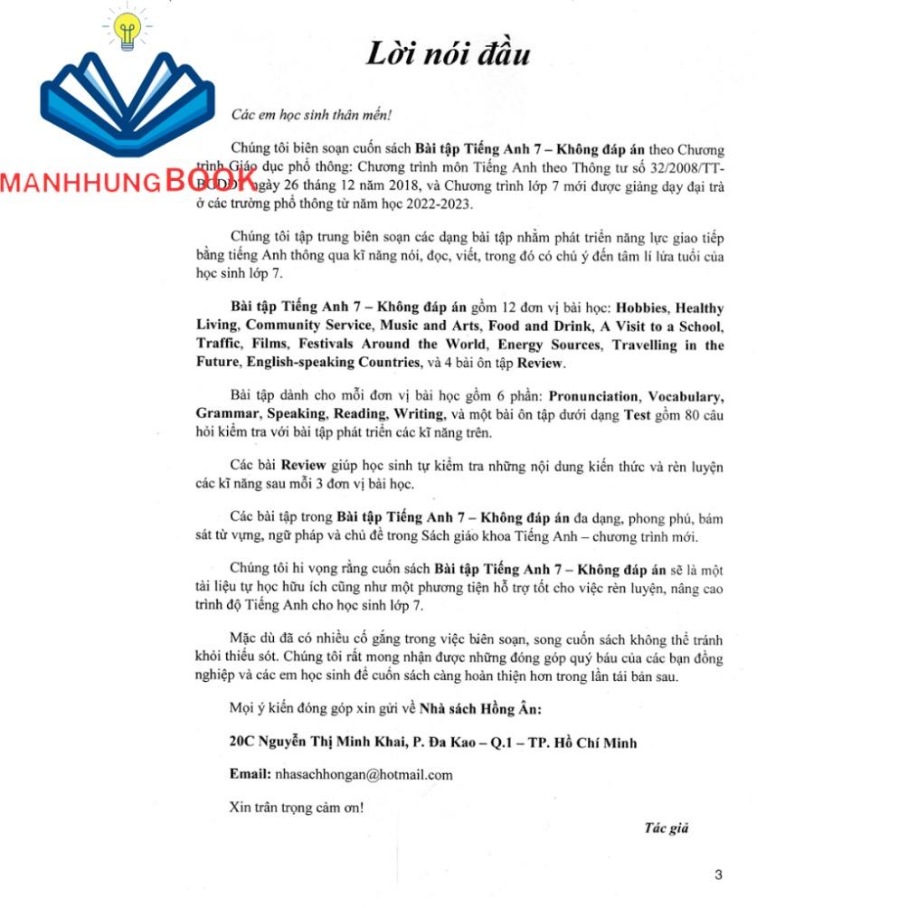 Chúng tôi hi vọng rằng cuốn sách Bài Tập Tiếng Anh 7 - Không Đáp Án (Bám Sát SGK Kết Nối) sẽ là một tài liệu tự học hữu ích cũng như một phương tiện hỗ trợ tốt cho việc rèn luyện, nâng cao trình độ Tiếng Anh cho học sinh lớp 7.