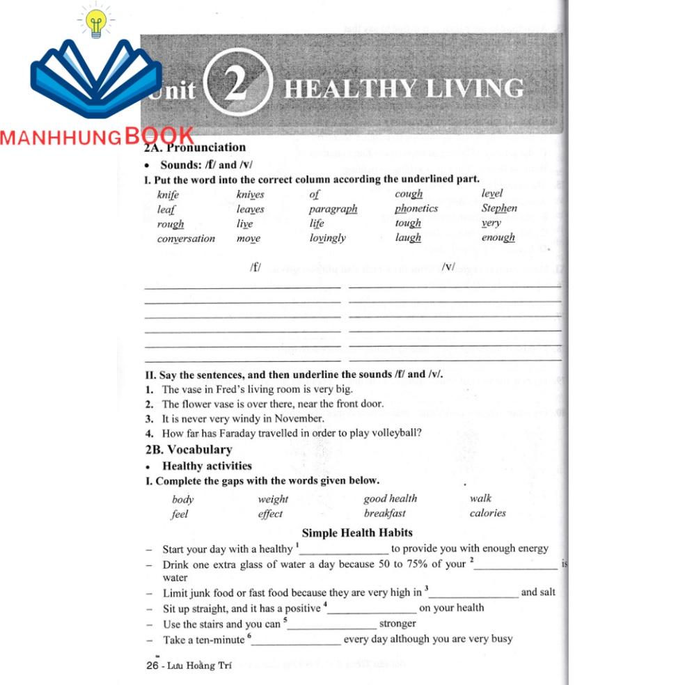 Bài tập dành cho mỗi đơn vị bài học gồm 6 phần: Pronunciation, Vocabulary, Grammar, Speaking, Reading, Writing, và một bài ôn tập dưới dạng Test gồm 80 câu hỏi kiểm tra với bài tập phát triển các kỹ năng trên.