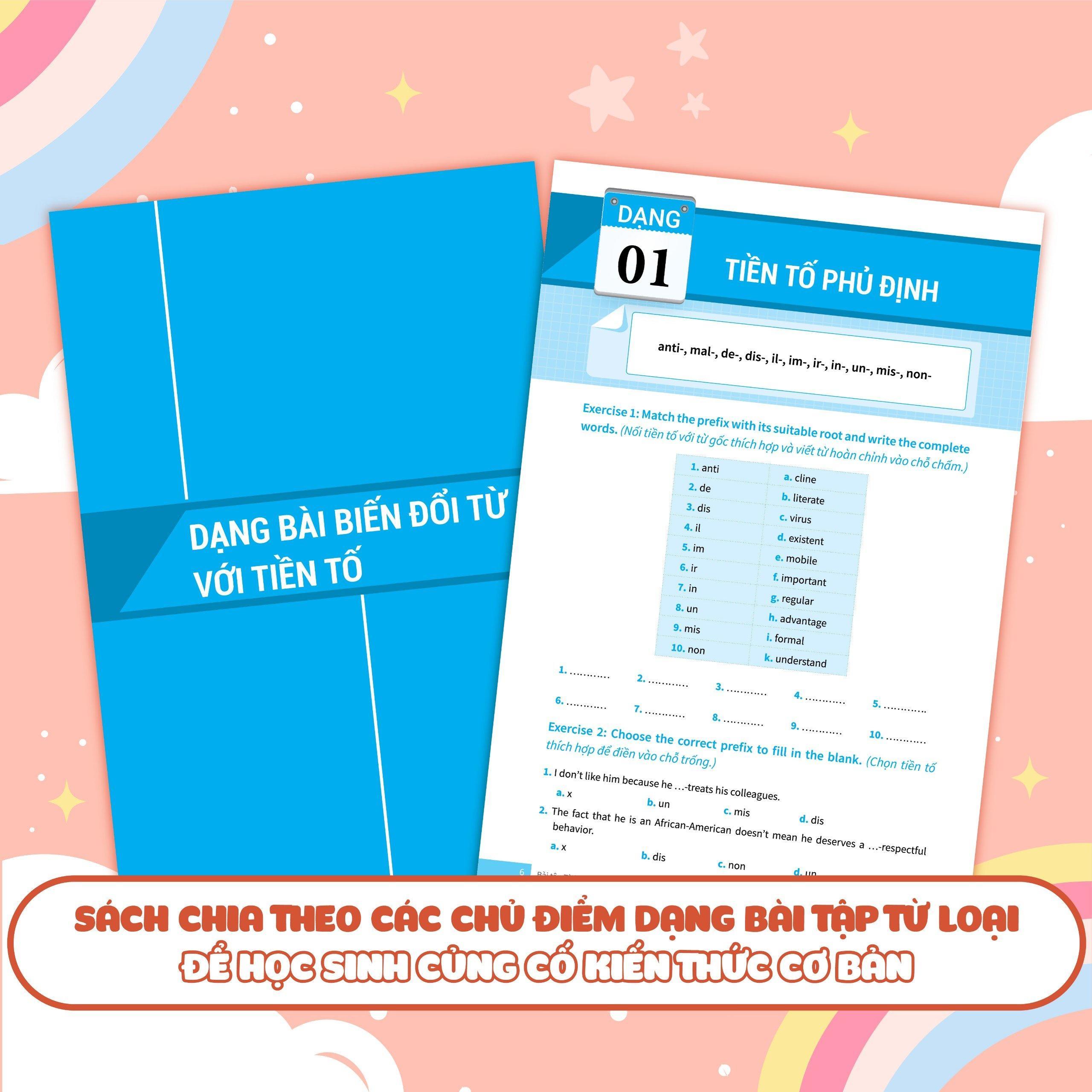 Với bài tập Từ Loại trong kì thi vào 10 và 10 chuyên môn Tiếng Anh, cuốn sách phân chia làm 3 dạng bài: