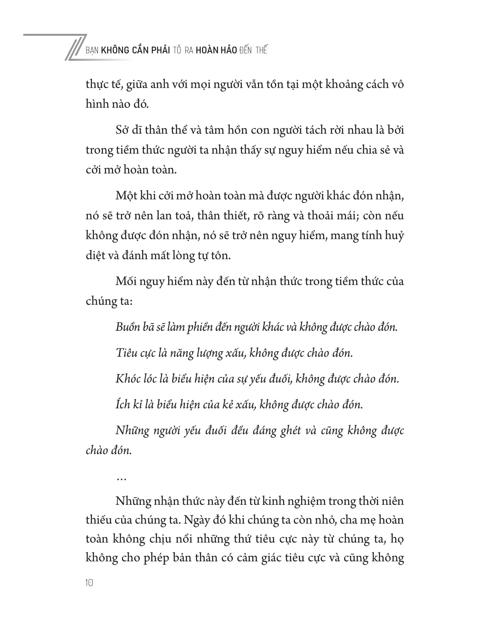 - Cuốn sách này sẽ hỗ trợ bạn thấu hiểu và chia sẻ cảm xúc của m.ình một cách tích cực và chân thành Ai cũng có lúc đau khổ, yếu mềm. Có thể bạn không chia sẻ nỗi đau của m.ình với tất cả mọi người, nhưng chỉ cần bạn xây dựng mối quan hệ với một vài người để bạn đủ tin tưởng chia sẻ những cảm xúc thật của m.ình, đời này coi như cũng đủ rồi. Bạn không cần phải lúc nào cũng thể hiện năng lượng tích cực, đôi khi, hãy chia sẻ cả sự yếu đuối và nỗi đau của bạn. Đó chính là cách để nâng cao mối quan hệ giữa bạn và người bạn tin tưởng, cũng như là để giúp chính bản thân bạn cảm thấy nhẹ nhàng hơn. Cuốn sách Bạn Không Cần Phải Tỏ Ra Hoàn Hảo Đến Thế sẽ hỗ trợ bạn đồng cảm, thấu hiểu và chia sẻ cảm xúc của m.ình một cách tích cực và chân thành; cũng như giúp bạn học cách yêu thươngvà được yêu thương, mở lòng m.ình với đối phương thật chân thực;từ đó bạn sẽ sống một cuộc đời nhẹ nhàng và ý nghĩa hơn! Bạn khôngcần phải tỏ ra hoàn hảo đến thế, hãy cùng học cáchchấp nhận và thương yêu cả những trầy xước của chính m.ình.