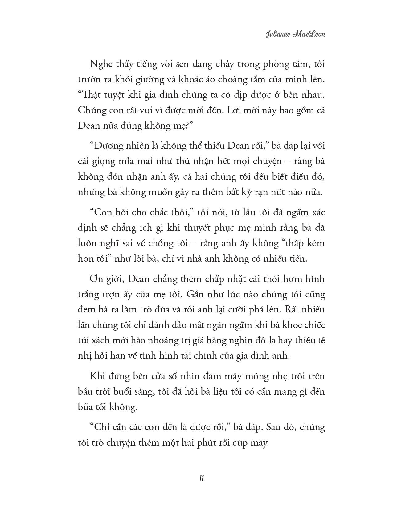 Bên Kia Vùng Biển Sáng Trăng Nội dung chính Olivia Hamilton, một cô gái trong sáng và thuần khiết, như ý nguyện được kết hôn với tình yêu của đời m.ình, Dean, chàng phi công quyến rũ chuyên lái máy bay riêng cho những người giàu có và nổi tiếng. Cuộc sống của họ trôi qua bình dị cho đến một ngày nọ, Dean đột ngột biến mất khi bay ngang qua Tam giác Quỷ Bermuda. Thế giới của Olivia đã hoàn toàn bị đảo lộn. Sau nhiều năm chờ đợi, cuối cùng Olivia cũng phải buông bỏ niềm hy vọng mong manh rằng người chồng yêu dấu của m.ình có thể vẫn còn sống. Melanie Brown là một nhà vật lý học ngày đêm nghiên cứu về bí ẩn của Tam giác Quỷ Bermuda. Nhưng hứng thú nghiên cứu của cô dần mất khi mẹ của cô qua đời trong một tai nạn thương tâm. Để làm lại cuộc đời và cứu vãn sự nghiệp của m.ình, cô quyết định tìm đến một phòng khám tâm lý, và bất ngờ bước vào cuộc tình ngang trái với chính bác sĩ trị liệu của m.ình. Tưởng chừng như cuộc đời của hai người phụ nữ này chẳng liên quan, nhưng họ lại bất ngờ giao nhau ở một điểm. Mối liên hệ kỳ lạ của hai người đã mở ra những bí mật có khả năng thay đổi mọi thứ mà Olivia nghĩ rằng cô ấy biết về cuộc hôn nhân, chồng cô ấy và quan trọng nhất là bản thân cô ấy. Với những khúc ngoặt đầy mê hoặc, Bên kia vùng biển sáng trăng là một cuốn tiểu thuyết sống động, giàu cảm xúc về sức mạnh lay động của tình yêu đánh mất rồi lại tìm thấy - và sức mạnh phi thường của một người phụ nữ đấu tranh cho hạnh phúc sau bi kịch. Tác giả Julianne MacLean là tác giả có sách bán chạy nhất của USA Today với hơn 30 tiểu thuyết, trong đó có bộ sách nổi tiếng Color of Heaven. Độc giả mô tả những cuốn sách của cô ấy là “ngoạn mục”, “có hồn” và “nâng đỡ tinh thần”. MacLean đã bốn lần lọt vào vòng chung kết của giải thưởng RITA dành cho Nhà văn Lãng mạn Hoa Kỳ và đã giành được nhiều giải thưởng, bao gồm Booksellers’ Best Award và Reviewers’ Choice Award của Romantic Times. Tiểu thuyết của cô đã bán được hàng triệu bản trên toàn thế giới và đã được dịch ra hơn 10 loại ngôn ngữ khác nhau. MacLean có bằng Văn học Anh tại King’'s College ở Halifax, Nova Scotia và bằng kinh doanh của Đại học Acadia ở Wolfville, Nova Scotia. Cô ấy thích đi du lịch và đã sống ở New Zealand, Canada và Anh. Cô hiện đang sống ở bờ biển phía đông Canada trong một ngôi nhà ven hồ cùng chồng và con gái.