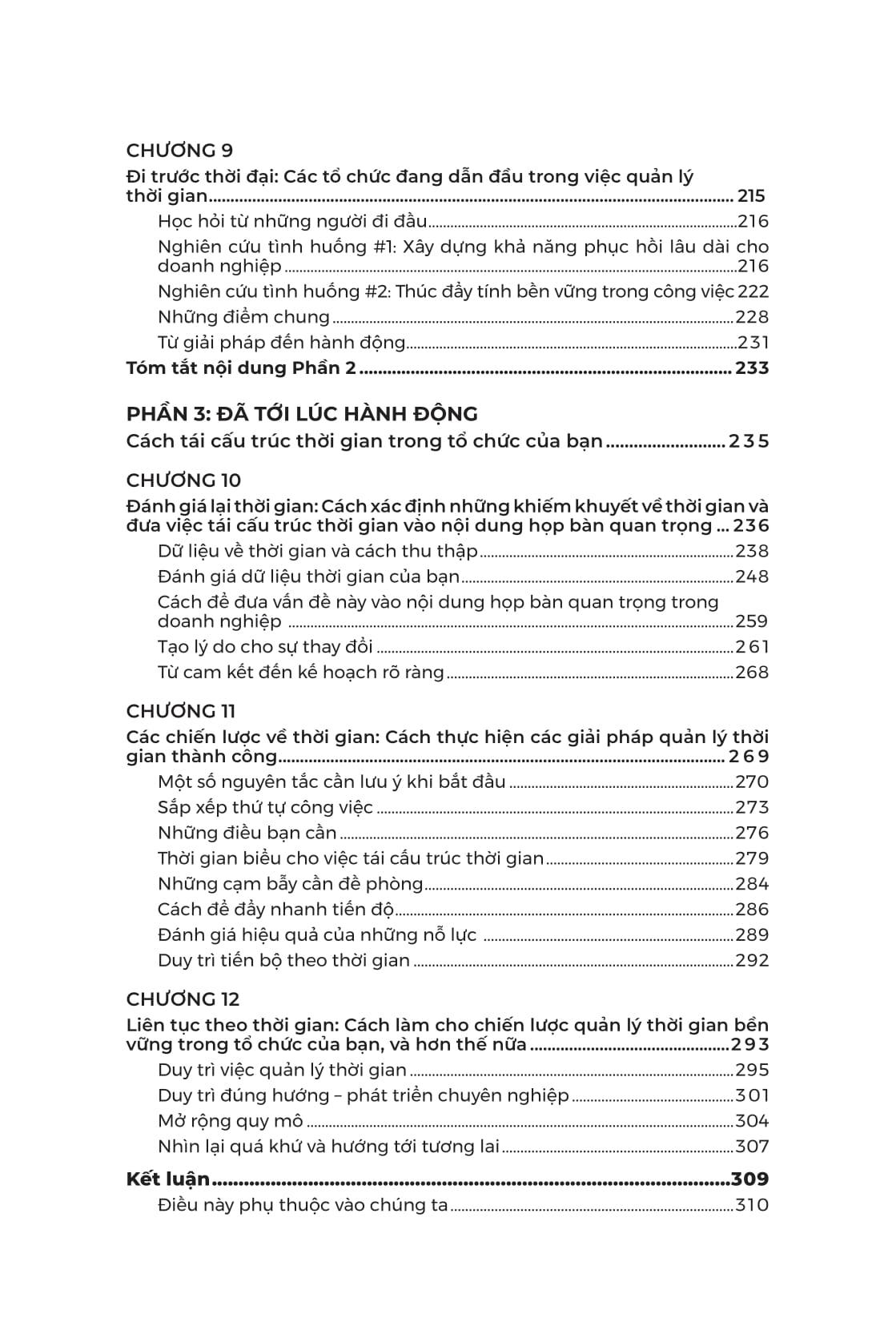 Phần cuối của cuốn sách là một cẩm nang thực tế, hướng dẫn từng bước để bạn và tổ chức biến ý tưởng thành hiện thực. Từ cách đánh giá “khuyết điểm thời gian” trong công việc hàng ngày, đến việc lập kế hoạch tái cấu trúc và duy trì sự thay đổi lâu dài, Helen Beedham không bỏ sót bất kỳ chi tiết nào. Bà khuyến khích bạn đặt những câu hỏi như “Tôi đang đầu tư thời gian vào đâu?” hay “Cách làm hiện tại có thực sự hiệu quả?”, biến chúng thành kim chỉ nam để tạo ra sự khác biệt, dù bạn là lãnh đạo hay chỉ đang tìm cách cải thiện cuộc sống công việc của chính m.ình.