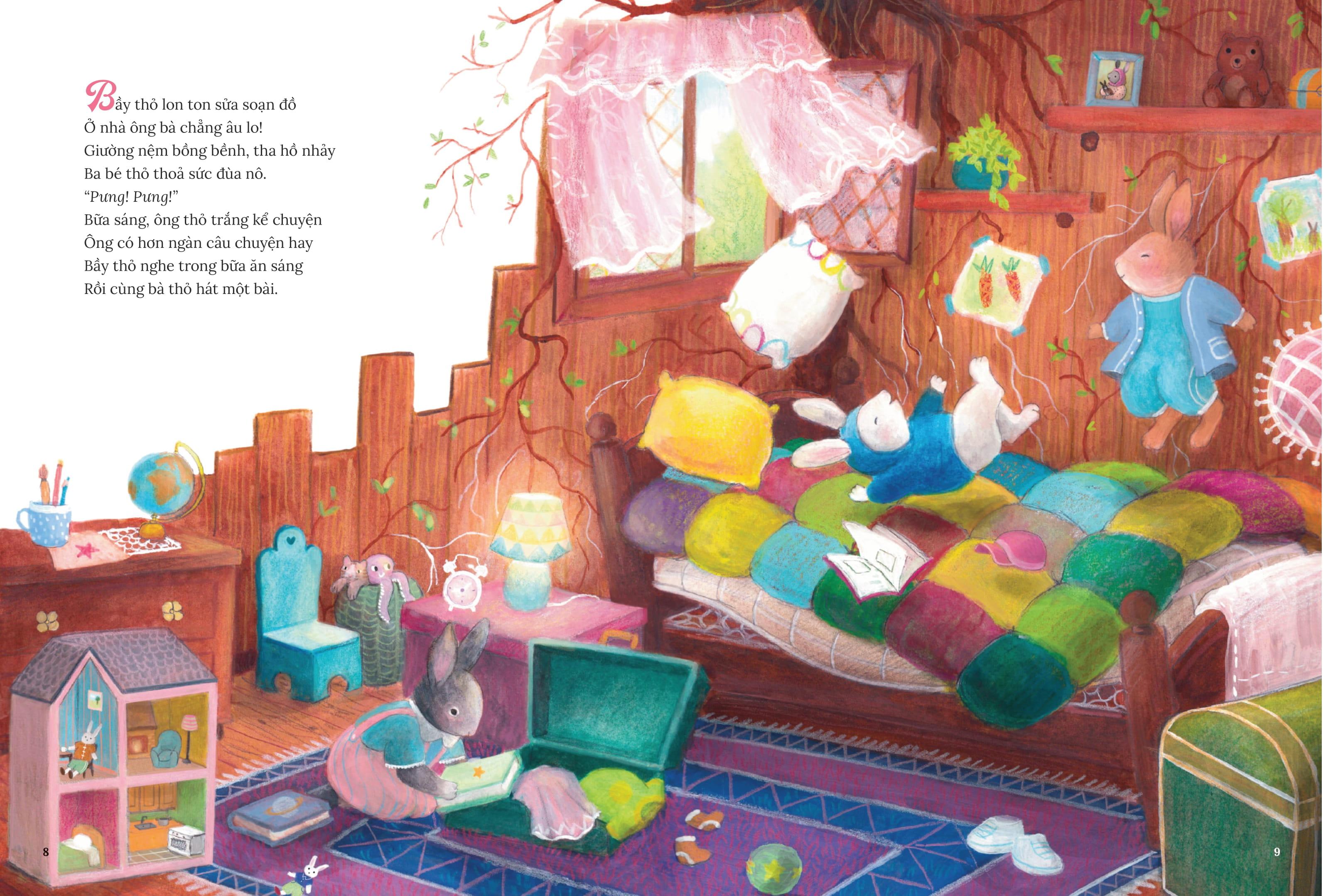 Đồng Dao Cổ Tích - Sách Song Ngữ Việt-Anh Cuốn sách kể về hành trình đi lạc vào thế giới siêu thực của hai chị em Thi Ca và Thi Họa. Đó là nơi của