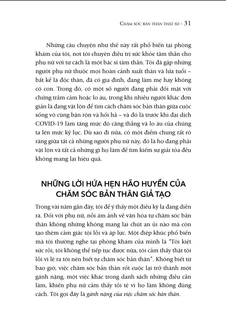 Ngày nay, khi nói đến “chăm sóc bản thân”, nhiều người nghĩ ngay đến những buổi spa thư giãn, khóa học yoga hay những phương pháp chăm sóc da, dưỡng tóc đắt tiền. Nhưng tất cả những điều đó có thật sự giúp chúng ta đạt được sự cân bằng và hạnh phúc không, hay chúng đơn thuần là những hình thức giải tỏa tạm thời để che đậy sự mệt mỏi và áp lực đang chồng chất? Đó chính là câu hỏi mà bác sĩ tâm thần chuyên về sức khỏe tinh thần phụ nữ Pooja Lakshmin đặt ra trong “Chăm sóc bản thân thật sự” (tựa gốc: Real self-care), một quyển sách đáng đọc trong thời đại phát triển bùng nổ của lĩnh vực chăm sóc sức khỏe thể chất và tinh thần.