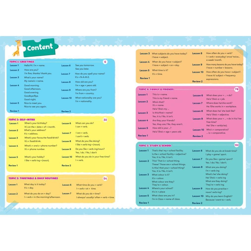 - Nội dung ngắn gọn, dễ học: 100 cấu trúc được gói gọn trong 10 chủ đề, mỗi chủ đề bao gồm 10 bài học Với các chủ đề quen thuộc và gần gũi trong cuộc sống như Greetings, Family & Friends, Study & School… không chỉ giúp các em tiếp thu kiến thức Ngữ pháp hiệu quả hơn mà còn biết cách vận dụng vào giao tiếp thực tế hàng ngày.