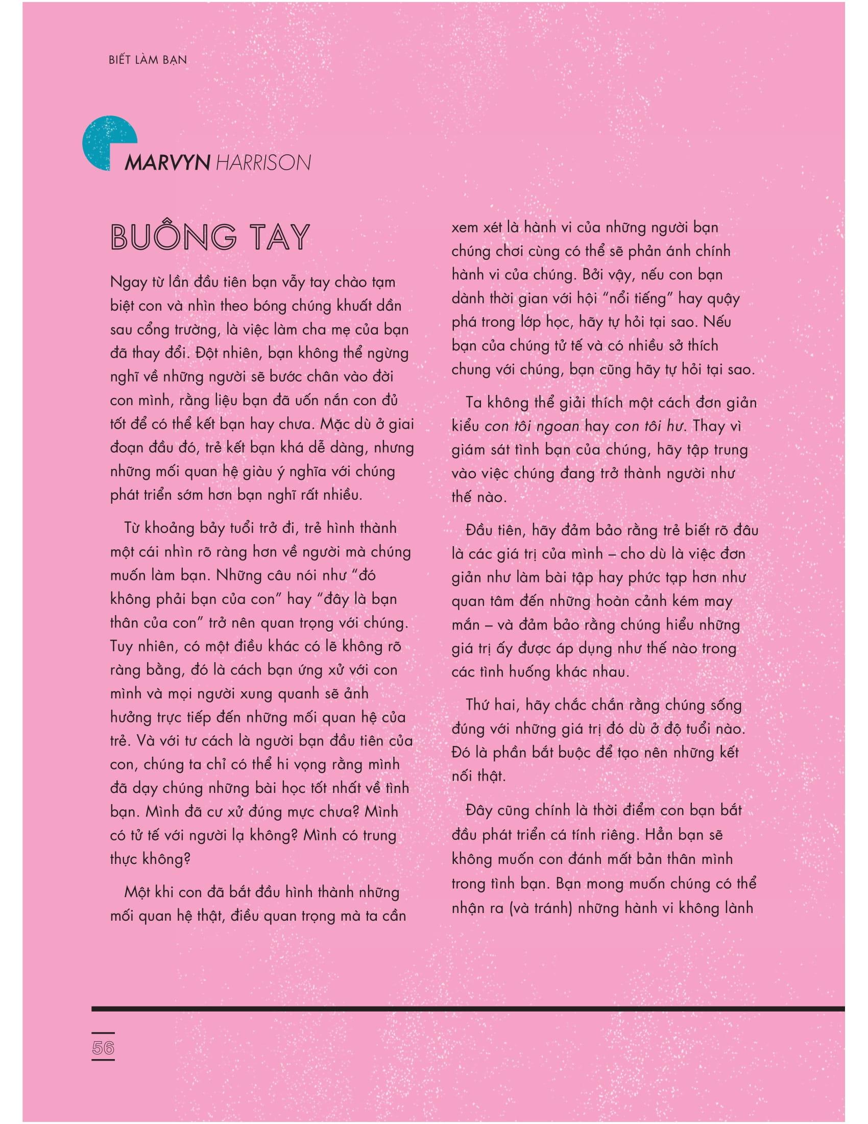 - Nội dung chính: Sách gồm 6 chương, mỗi chương đề cập đến một khía cạnh khác nhau của việc nuôi dạy trẻ trong thế kỉ 21; trong đó mỗi người góp chữ sẽ chia sẻ một góc nhìn độc đáo của riêng m.ình; cuối mỗi phần nhỏ là mục Kế hoạch hành động cung cấp các ý tưởng và hướng dẫn chi tiết để độc giả có thể thực hành cùng con: Chương 01 – Biết yêu hành tinh này Chương 02 – Biết làm bạn Chương 03 – Biết xây dựng cộng đồng Chương 04 – Biết bày tỏ ý kiến Chương 05 – Biết chơi cùng nhau Chương 06 – Biết cùng khám phá