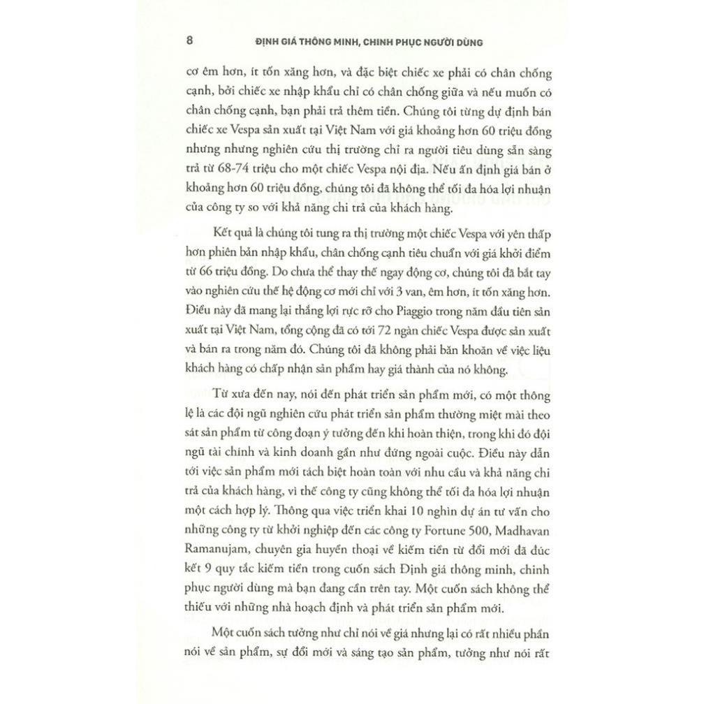 Cuốn sách này cung cấp 9 quy tắc kiếm tiền từ những đổi mới, được xây dựng dựa trên những bài học mà Simon - Kucher & Partners đã chắt lọc được thông qua việc thực hiện hơn 10.000 dự án thay mặt cho các công ty trên khắp thế giới. Lượng kiến thức khổng lồ này cho phép các tác giả xác định những vấn đề và giải pháp về kiếm tiền từ các sản phẩm mới. Ví dụ, trong khi hầu hết chúng ta tin rằng có nhiều lý do khiến sản phẩm mới thất bại, thì "Định giá thông minh, chinh phục người dùng" cho thấy rằng các thất bại chủ yếu thuộc 4 nhóm sau: Sốc đặc điểm, Khiêm nhường thái quá, Viên ngọc ẩn và xác sống – mỗi loại đều có thể dễ dàng được ngăn chặn.