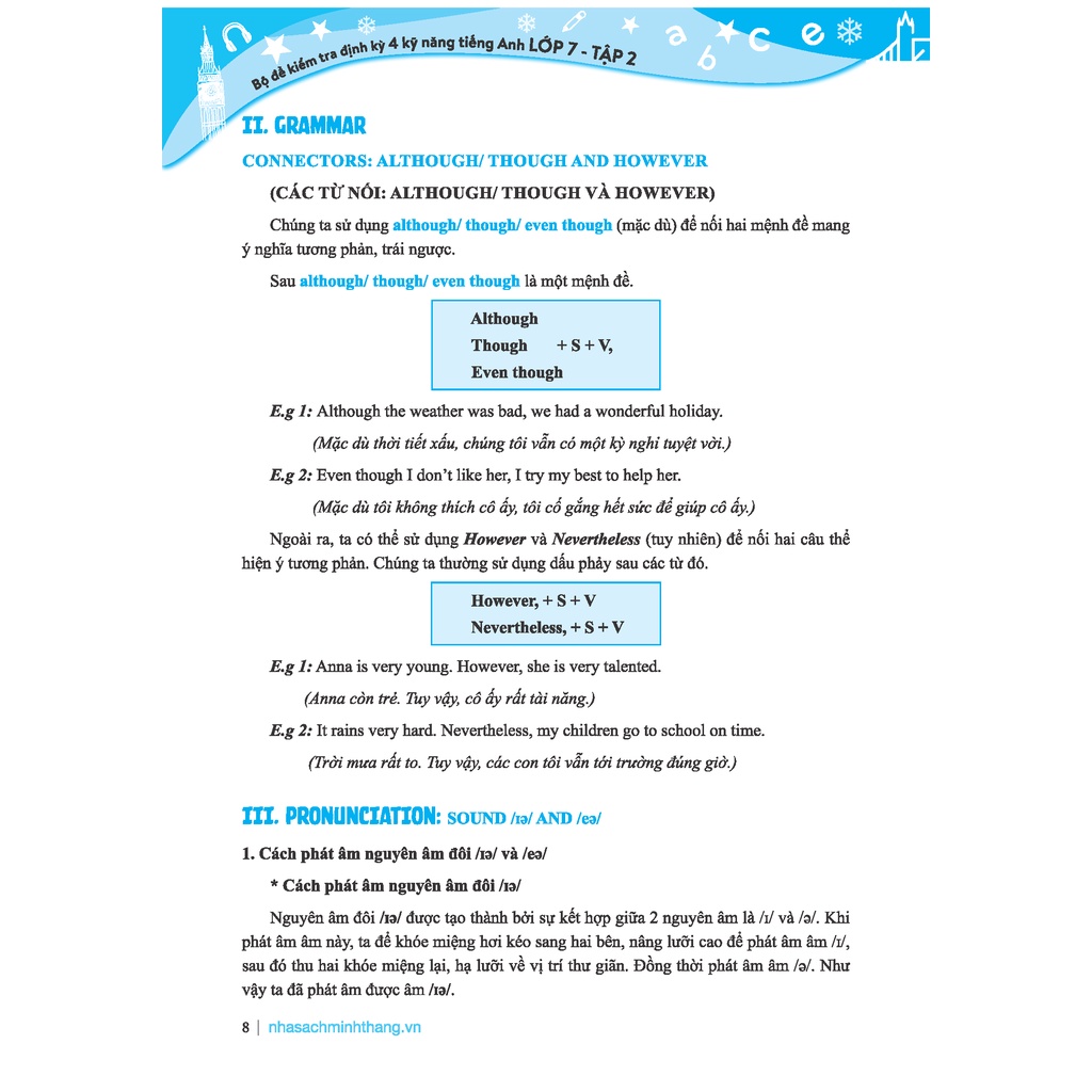 Tác giả: Đại Lợi (chủ biên) - Hằng Nguyễn   Giá bìa: 85.000 ₫   NXB: NXB Đại Học Quốc Gia Hà Nội   Phát hành: Minh Thắng   Năm xuất bản: 2023(ISBN: 86)(Mã sách: 58)   Dạng bìa: bìa mềm   Số trang: 148 trang   Kích thước: 19 x 27 cm           ========GIỚI THIỆU SÁCH=========   Các em học sinh thân mến!   Trên hành trình tìm kiếm tri thức, các em thường xuyên phải đối mặt với các bài kiểm tra định kì, khiến các em cảm thấy căng thẳng, lo lắng và đôi khi kết quả không như mong đợi. Điều này không hẳn do các em chưa thật sự chăm chỉ hay không hiểu bài dẫn đến kết quả không đạt được như kỳ vọng, đôi khi còn phụ thuộc vào nhiều yếu tố như kĩ năng làm bài, kĩ năng quản lý thời gian hay chưa nắm được kết cấu đề Thấu hiểu được những khó khăn và những tình huống các em thường gặp phải, nhóm tác giả đã dành nhiều thời gian biên soạn “Bộ đề kiểm tra định kỳ 4 kỹ năng nghe - nói - đọc - viết Tiếng Anh lớp 7” nhằm rên luyện cho các em kĩ năng làm bài thi, làm chủ các dạng đề, hiểu được kết cấu và cách thức ra đề của từng kỳ thi. Khi các em đã quen với các dạng bài tập và trải nghiệm làm đề thường xuyên thì việc tự tin trước các kỳ thi là điều hiển nhiên có được.   Bộ sách được thiết kế theo 3 phần chính:   Phần A: Lý thuyết   Gồm từ vựng và ngữ pháp chi tiết của từng bài học giúp các em củng cố, nắm vững được các nội dung đã học và sẽ kiểm tra.   Phần B: Đề kiểm tra định kỳ
