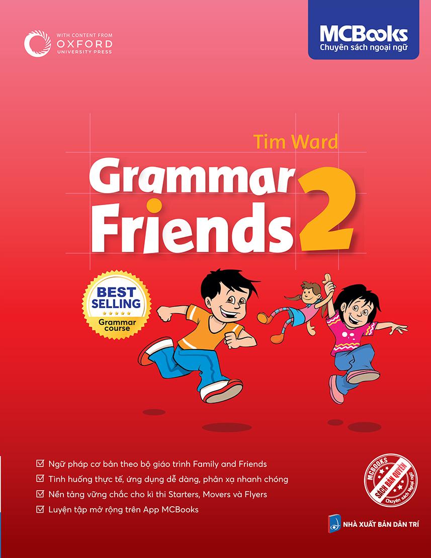 Mua tại TiktokGrammar Friends 2 Grammar Friends 2 là cuốn sách nằm trong bộ giáo trình nổi tiếng Grammar Friends dành cho trẻ em độ tuổi từ 6 đến 12 tuổi do Nhà xuất bản Đại học Oxford xuất bản. Với cấu trúc bài học logic và hình ảnh minh họa sinh động, cuốn sách giúp người học làm quen và ghi nhớ các điểm ngữ pháp cốt lõi trong chương trình tiếng Anh một cách tự nhiên. Đây là một trong những lựa chọn hàng đầu cho giáo viên và phụ huynh khi muốn con trẻ nâng cao kiến thức ngữ pháp bài bản ngay từ đầu. Nội Dung Chính Nội dung cuốn sách được chia thành các phần theo từng review, giúp học sinh nắm vững ngữ pháp một cách có hệ thống: Starter: About us
