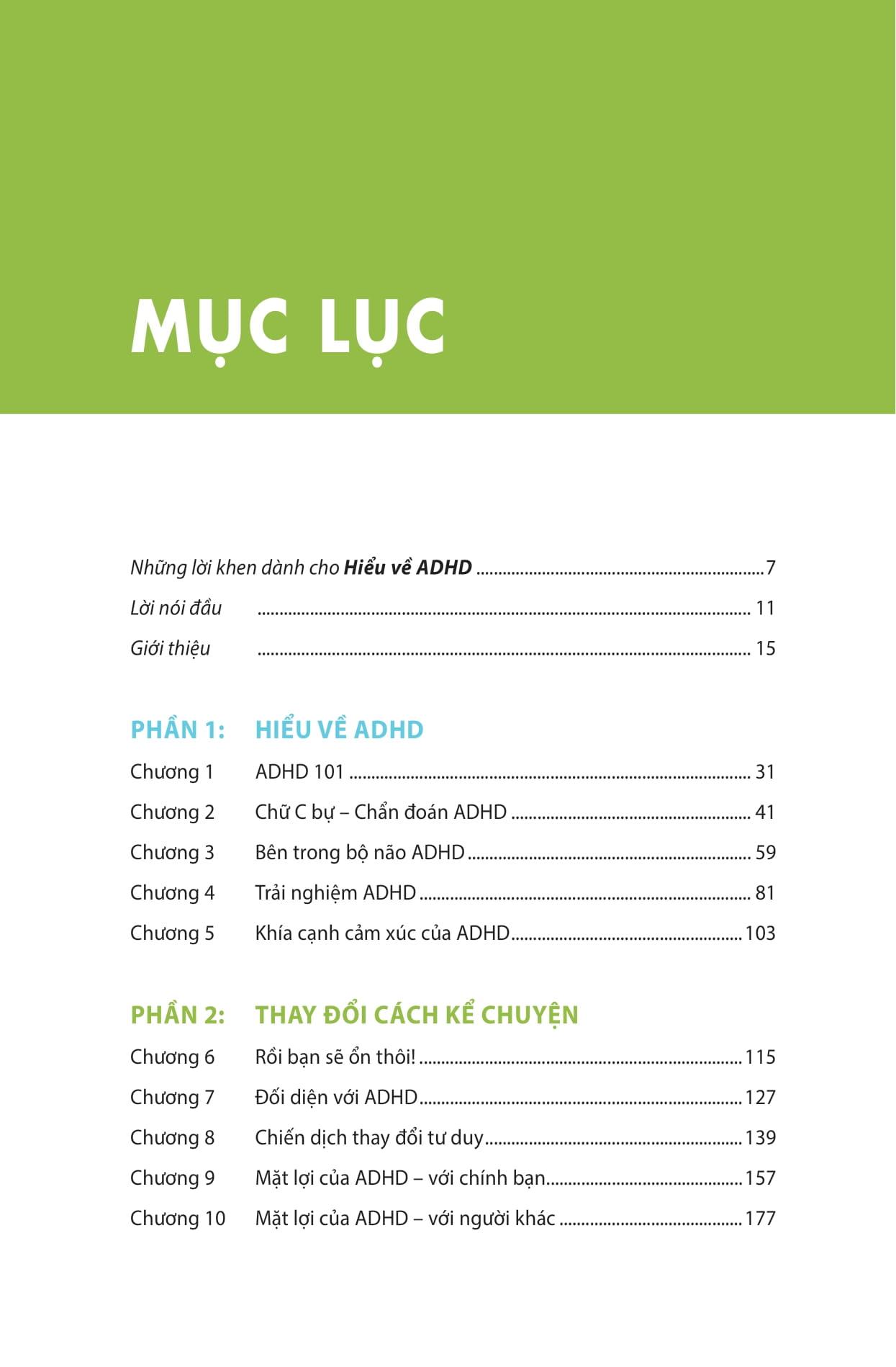 Nội dung sách được chia thành ba phần. Ở phần đầu, Penn và Kim giải thích ADHD là gì, nguyên nhân từ đâu, biểu hiện ra sao ở trẻ em, người lớn, phụ nữ và các nhóm khác nhau. Bạn sẽ nhận ra những hiểu lầm phổ biến – như việc cho rằng ADHD đồng nghĩa với “thiếu tập trung” hay “lười biếng”, thực chất chỉ là kết quả của sự thiếu hiểu biết về cách não bộ ADHD xử lý thông tin. Phần hai tập trung vào việc thay đổi câu chuyện mà chúng ta vẫn thường kể về ADHD. Thay vì chỉ nói về khuyết điểm và hạn chế, tác giả chỉ ra những khía cạnh tích cực, cả trong công việc, sáng tạo, mối quan hệ và cuộc sống. Cuối cùng, phần ba đưa ra những chiến lược thực tiễn: cách quản lý năng lượng, xây dựng thói quen, điều chỉnh môi trường sống, hoàn thành mục tiêu và chăm sóc bản thân.