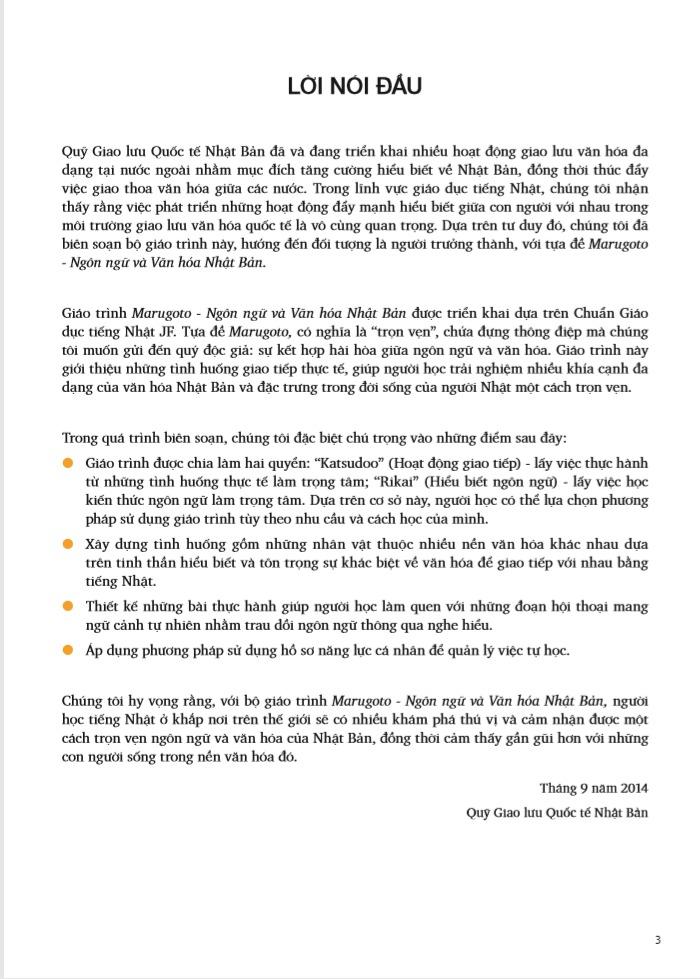 Hoạt Động Giao Tiếp A2 - Sơ Cấp 2 - Ngôn Ngữ Và Văn Hóa Nhật Bản Ngay sau khi ra mắt bộ giáo trình Marugoto A2 Sơ cấp 1, First News – Trí Việt tiếp tục phát hành Marugoto A2 Sơ cấp 2 giúp người đọc nâng cao trình độ giao tiếp tiếng Nhật. Marugoto là một giáo trình công phu và đầy tâm huyết của Nhật Bản với mong muốn phổ cập và nâng cao tiếng Nhật cho người nước ngoài ở khắp thế giới. Giáo trình được triển khai dựa trên Chuẩn Giáo dục tiếng Nhật JF. Tựa đề Marugoto, có nghĩa là “trọn vẹn”, đó cũng chính là thông điệp mà Quỹ Giao lưu Quốc tế Nhật Bản muốn gửi đến quý độc giả: sự kết hợp hài hòa giữa ngôn ngữ và văn hóa. Giáo trình này giới thiệu những tình huống giao tiếp thực tế, giúp người học trải nghiệm nhiều khía cạnh đa dạng của văn hóa Nhật Bản và đặc trưng trong đời sống của người Nhật một cách trọn vẹn. Cấp độ A2 thuộc mức độ sơ cấp và trình độ A2-2 là trình độ nâng cao hơn sau khi bạn đã học qua A2-1. Tương tự với những cuốn Marugoto trước đó, Marugoto - Ngôn ngữ và Văn hóa Nhật Bản A2-2 cũng được chia làm 2 quyển “Katsudoo” (Hoạt động giao tiếp) và “Rikai” (Hiểu biết ngôn ngữ). Qua đó có thể giúp người học lựa chọn được phương pháp sử dụng giáo trình tùy theo nhu cầu và cách học của m.ình. Giáo trình này có những điểm đặc trưng sau: Giáo trình Marugoto Rikai - Hiểu biết ngôn ngữ được xây dựng với trọng tâm là các kiến thức ngôn ngữ (chữ viết, từ vựng, ngữ pháp,…) để bổ trợ cho hoạt động giao tiếp. Giáo trình Marugoto Katsudoo - Hoạt động giao tiếp được xây dựng với trọng tâm là các hoạt động giao tiếp ngôn ngữ. Xây dựng tình huống gồm những nhân vật thuộc nhiều nền văn hóa khác nhau dựa trên tinh thần hiểu biết và tôn trọng sự khác biệt về văn hóa để giao tiếp với nhau bằng tiếng Nhật. Thiết kế những bài thực hành giúp người học làm quen với những đoạn hội thoại mang ngữ cảnh tự nhiên nhằm trau dồi ngôn ngữ thông qua nghe hiểu. Áp dụng phương pháp sử dụng hồ sơ năng lực cá nhân để quản lý việc tự học. Cung cấp miễn phí các dữ liệu âm thanh: và rất nhiều các tài liệu miễn phí khác như danh sách từ vựng, tài liệu hỗ trợ giảng dạy dành cho các giáo viên sử dụng Marugoto Những tài liệu kèm theo giáo trình Rikai: Tệp âm thanh Phiếu sakubun Danh sách từ vựng Danh sách các cách nói cố định Danh sách từ vựng kanji Phiếu Tự đánh giá tiếng Nhật Những tài liệu kèm theo giáo trình Katsudoo Tệp âm thanh Phiếu thực hành viết Danh sách từ vựng Danh sách các cách nói cố định Phiếu Tự đánh giá Can-do Sau khi hoàn thành giáo trình Marugoto A2-2 sẽ giúp học viên: Có thể hiểu được các câu văn hoặc các cách diễn đạt thường dùng trong các vấn đề liên quan trực tiếp đến bản thân như: thông tin cá nhân cơ bản, thông tin về gia đình, mua sắm, hàng xóm, công việc,… Có thể trao đổi thông tin về các sự việc gần gũi thường ngày trong ngữ cảnh đơn giản, thường nhật. Có thể dùng ngôn từ đơn giản để giải thích về hoàn cảnh, cuộc sống quanh m.ình cũng như sự việc nằm trong các lĩnh vực cần thiết, liên quan trực tiếp tới bản thân. Chúng tôi hy vọng rằng, với bộ giáo trình Marugoto - Ngôn ngữ và Văn hóa Nhật Bản, người học tiếng Nhật ở khắp nơi trên thế giới sẽ có nhiều khám phá thú vị và cảm nhận được một cách trọn vẹn ngôn ngữ và văn hóa của Nhật Bản, đồng thời cảm thấy gần gũi hơn với những con người sống trong nền văn hóa đó.