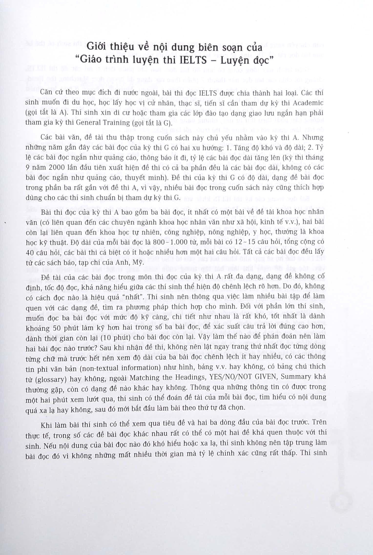 IELTS Reading Strategies For The IELTS Test Giáo trình này tổng cộng có hơn 80 bài đọc, sau khi phân tích tỉ mỉ các đề thi IELTS, chúng tôi chia các bài đọc này thành 7 phần theo các dạng đề luyện đọc: Matching the Headlings (Lắp ghép tiêu đề văn bản), Cloze (Điền ô trống), Multiple Choice (Chọn lựa nhiều mục), Summarizing (Tóm tắt), YES/ NO/ NOT GIVEN (Đúng, sai, không đề cập), Scanning for Answers (Tìm nhanh đáp án) và Integrated Exercises (Bài tập tổng hợp). Mặc dù người đọc không cần phải theo thứ tự này, nhưng dạng đề của phần bài tập tổng hợp đa dạng hơn, do đó hãy làm quen với các dạng đề thi trước rồi làm phần này sau. Phần bài thi mẫu trong cuốn sách này tổng cộng có 6 đề. Theo các thí sinh đã từng làm các đề thi này và tham dự kỳ thi IELTS, các đề này khó hơn và dài hơn đề thi thực tế một chút, nhưng dạng đề không có sự khác biệt. Đây cũng là chủ ý của tác giả khi biên soạn các đề thi này. Người đọc có thể làm các đề này theo yêu cầu thực tiễn ở từng gia đoạn để quan sát sự tiến bộ và xác định những khó khăn của m.ình. Bài đọc trong các kỳ thi IELTS khác với bài đọc tiếng Anh thường ngày và bài đọc trong các kỳ thi tiếng Anh khác. Thông thường, đọc là một phương thức thu thập thông tin, còn các bài đọc trong kỳ thi IELTS là thông qua việc đọc để giải quyết các vấn đề cụ thể. Nó cách khác, thông qua việc đọc để tìm ra đáp án của câu hỏi. Trong quá trình học và sử dụng tiếng Anh nhiều năm, các họ sinh phần nào hình thành các đọc riêng của m.ình. Những cách đọc này có lẽ rất hiệu quả trong học tập và công việc, nhưng khi áp dụng vào bài thi đọc IELTS có thể họ sẽ gặp khó khăn bởi các yếu tố như thời gian có hạn, dạng đề đặc biệt …. Vì vậy, tác giả đề nghị khi làm bài tập trong cuốn sách này, trước hết phải hiểu chỉ dẫn (instruction), làm rõ nhiệm vụ (task), cần biết phải hoàn thành trong thời gian bao lâu (suggested time), sau đó bắt đầu đọc. Trong cuốn sách này, người đọc cần chú trông việc nâng cao kỹ năng đọc, đồng thời tìm ra cách đọc thích hợp với từng dạng đề.