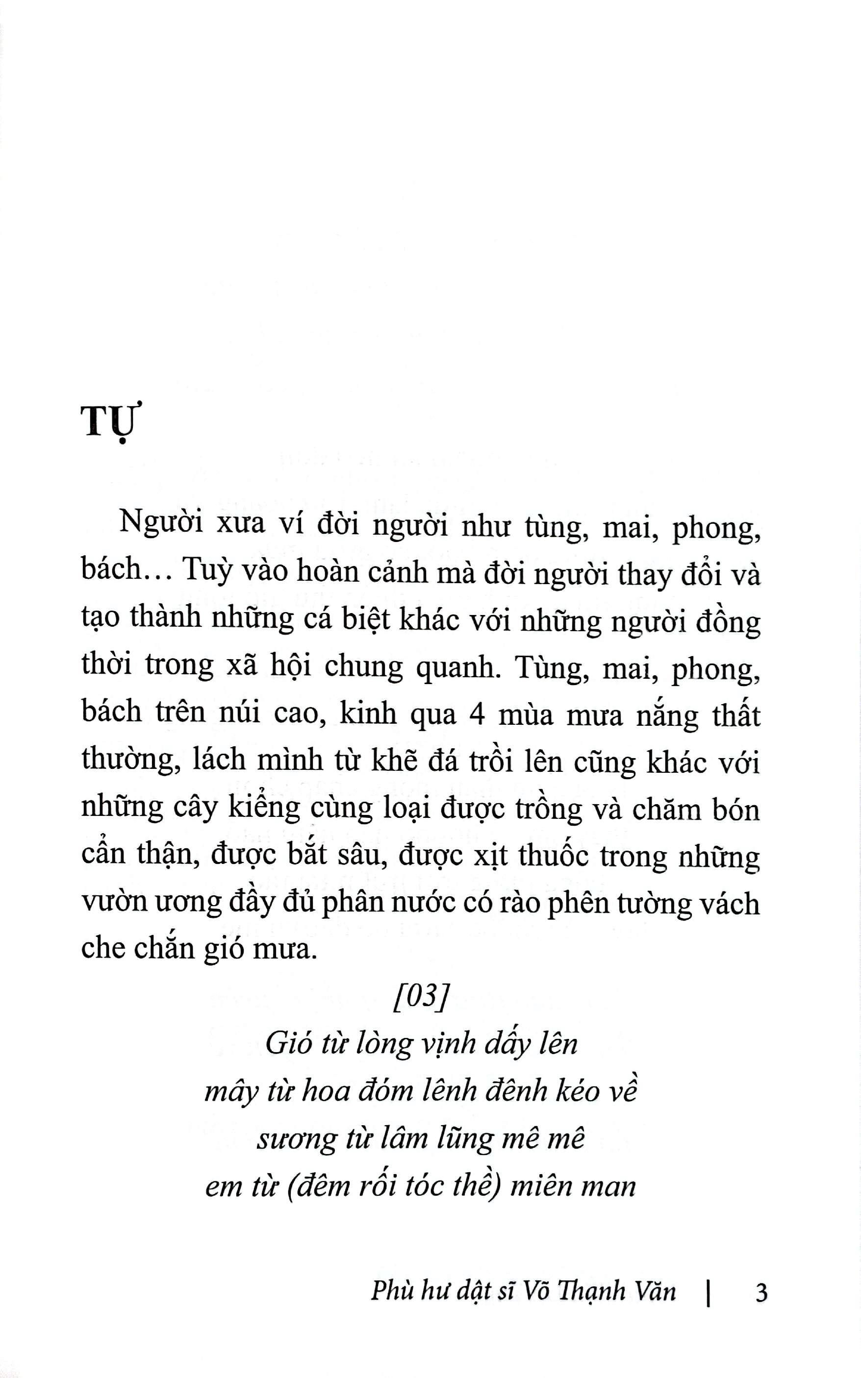 Người xưa ví đời người như tùng, mai, phong, bách... Tuỳ vào hoàn cảnh mà đời người thay đổi và tạo thành những cá biệt khác với những người đồng thời trong xã hội chung quanh. Tùng, mai, phong, bách trên núi cao, kinh qua 4 mùa mưa nắng thất thường, lách m.ình từ khẽ đá trồi lên cũng khác với những cây kiểng cùng loại được trồng và chăm bón cẩn thận, được bắt sâu, được xịt thuốc trong những vườn ương đầy đủ phân nước có rào phên tường vách che chắn gió mưa.