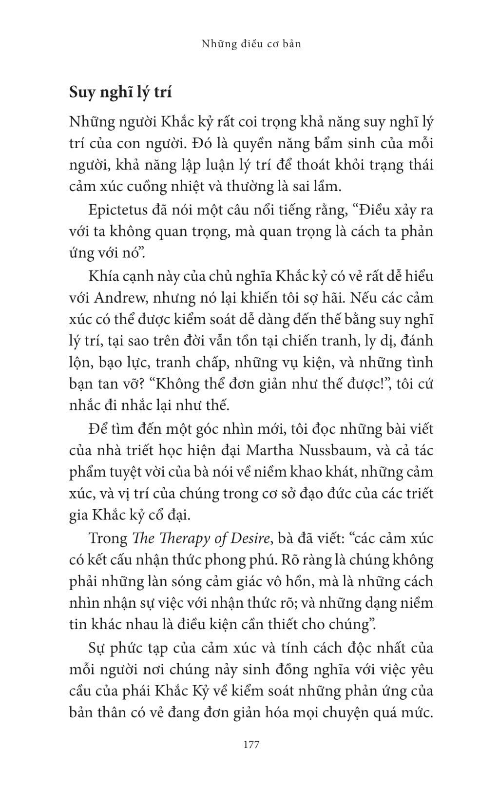 Tác giả là nhà báo, cây viết lâu năm. Bà tiếp cận chủ nghĩa Khắc kỷ với tinh thần vừa cởi mở vừa phản biện. Cuốn sách phân tích và gạn lọc những công tụ từ triết lý Khắc kỷ cổ xưa, đặt nó vào cuộc sống hiện đại, chỉ cho con người hiện đại một cách nữa để đối mặt với những vấn đề đương thời. Sách chia thành những bài viết ngắn có tiêu đề bắt đầu bằng “Làm sao để…”, ví dụ như: