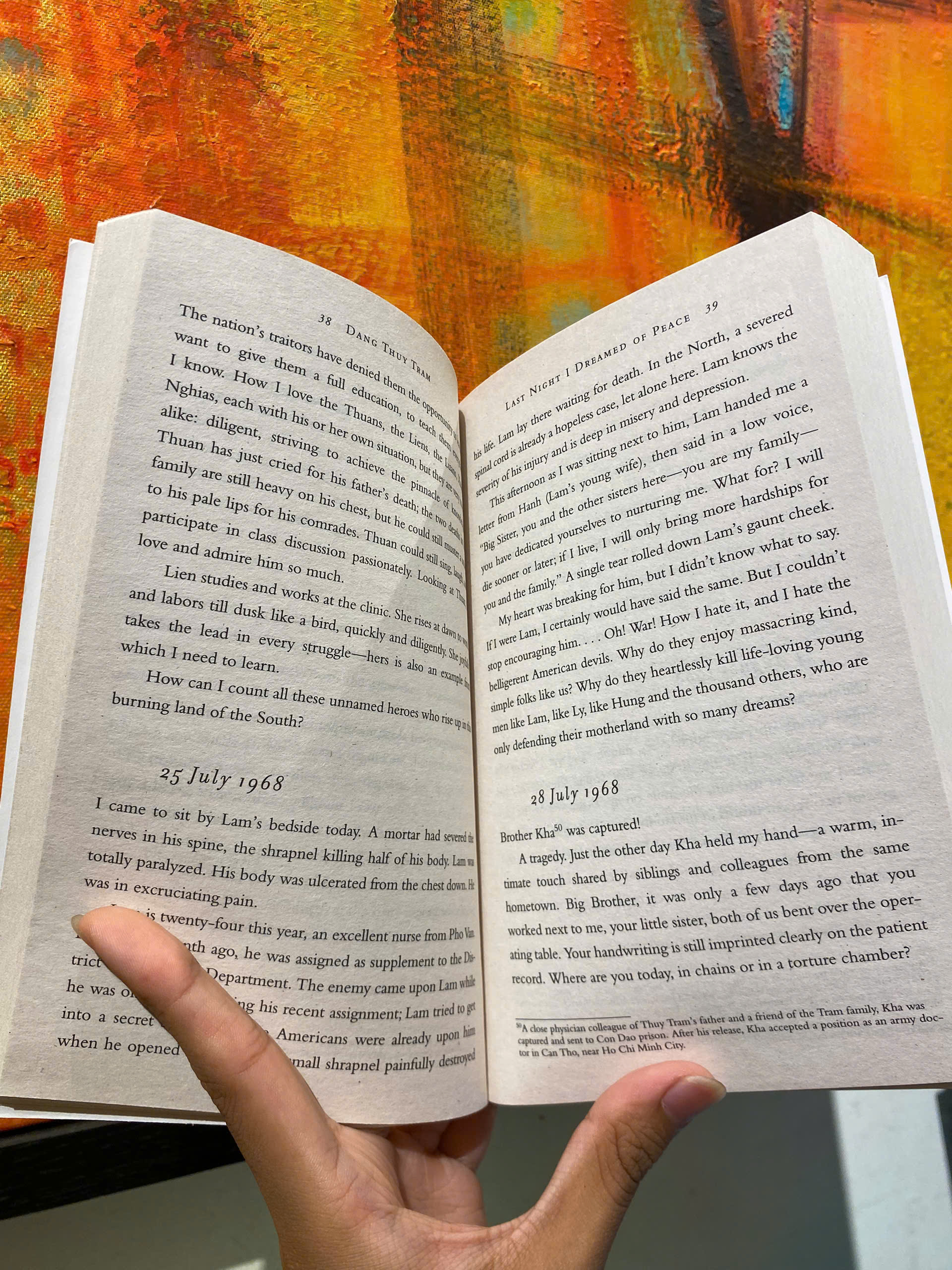 Đêm Cuối Tôi Mơ Về Hòa Bình là cuốn nhật ký xúc động được lưu giữ bởi một bác sĩ Việt Nam 27 tuổi, người bị Mỹ giết trong chiến tranh Việt Nam, khi cố gắng bảo vệ bệnh nhân của mình. Nó không chỉ là một lát cắt lịch sử quan trọng, nhìn từ phía đối diện của Công văn và Ngày tận thế, mà nó còn cho thấy nữ ca sĩ Đặng Thùy Trâm - là một con người sôi nổi, tràn đầy lý tưởng tuổi trẻ, một con người đầy khát khao yêu thương, cố gắng hết mình. xứng đáng với Đảng Cộng sản và cố gắng hết sức để chăm sóc bệnh nhân của mình trong những điều kiện tồi tệ.