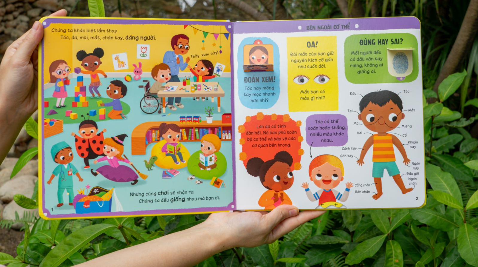 Lift-The-Flap-Lật Mở Khám Phá - Những Kiến Thức Đầu Đời - Cơ Thể Tuyệt Diệu Bạn có biết, cơ thể người là một trong những chủ đề mà các em bé cực kỳ tò mò từ khi lên 3 tuổi không? Con quan tâm và thắc mắc về những hoạt động của cơ thể m.ình như: nhắm mở mắt, thức ăn sẽ trôi đi đâu, trái tim có hình gì, sao con có màu tóc hay chiều cao khác với các bạn khác… Vậy thì hãy cùng mở ngay cuốn sách thú vị này để con giải đáp tất tần tật những thắc mắc của m.ình về chủ đề “cơ thể tuyệt diệu” nhé. Một cuốn sách xinh xắn với 05 ưu điểm vượt trội: Trình bày nội dung logic theo từng chủ điểm nhỏ, giúp trẻ khám phá từ ngoài cơ thể đến bên trong, rồi học các thói quen tốt cho sinh hoạt và sức khỏe. Tranh vẽ siêu dễ thương, màu sắc rực rỡ với các khối hình tương phản cực kỳ bắt mắt, giúp kích thích sự phát triển thị giác và gia tăng hứng thú khám phá thông tin của trẻ. Các miếng LẬT - MỞ diệu kỳ, thú vị như một trò chơi khuyến khích trẻ dùng tay tương tác, dùng mắt theo dõi và tập trung tâm trí để tiếp thu kiến thức tốt hơn, ghi nhớ hơn và phát triển tư duy so sánh, phân tích tốt hơn. Khổ sách to, bìa cứng, trang sách cứng dày 2mm, bo tròn tất cả các góc cạnh giúp trẻ sử dụng an toàn và rất bền. Cuốn sách phù hợp với phổ tuổi rộng từ 3-6 tuổi. 3-4 tuổi con tập trung kích thích giác quan và khám phá kiến thức cơ bản qua hoạt động Lật-Mở miếng ghép. 5-6 tuổi con được khuyến khích hiểu cơ thể và áp dụng các bài học kỹ năng chăm sóc, vệ sinh, bảo vệ bản thân.