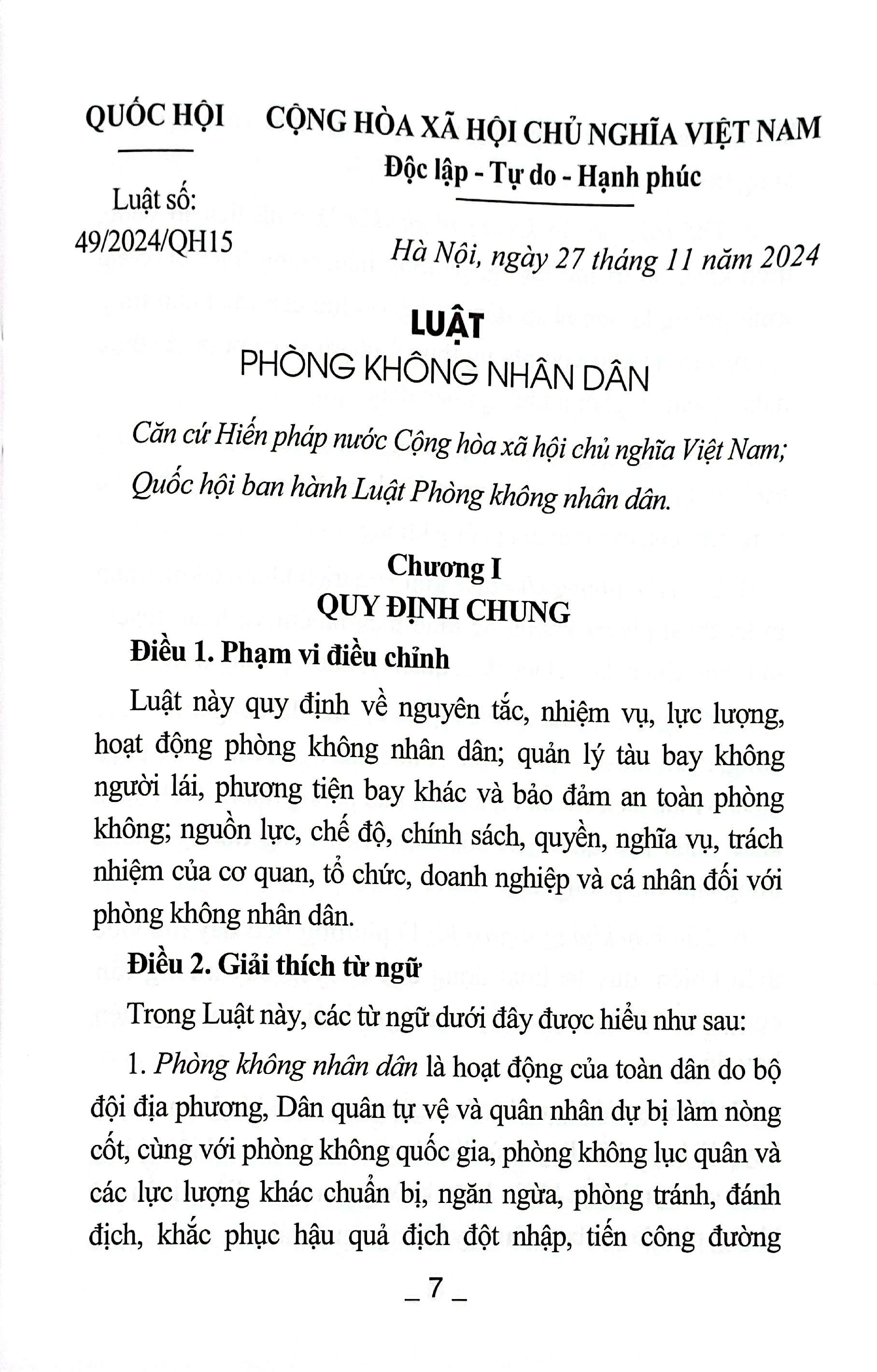 Luật Phòng Không Nhân Dân Luật số: 49/2024/QH15 ngày 27 tháng 11 năm 2024 Luật này quy định về nguyên tắc, nhiệm vụ, lực lượng, hoạt động phòng không nhân dân; quản lý tàu bay
